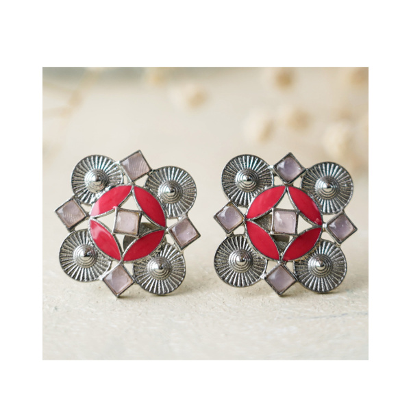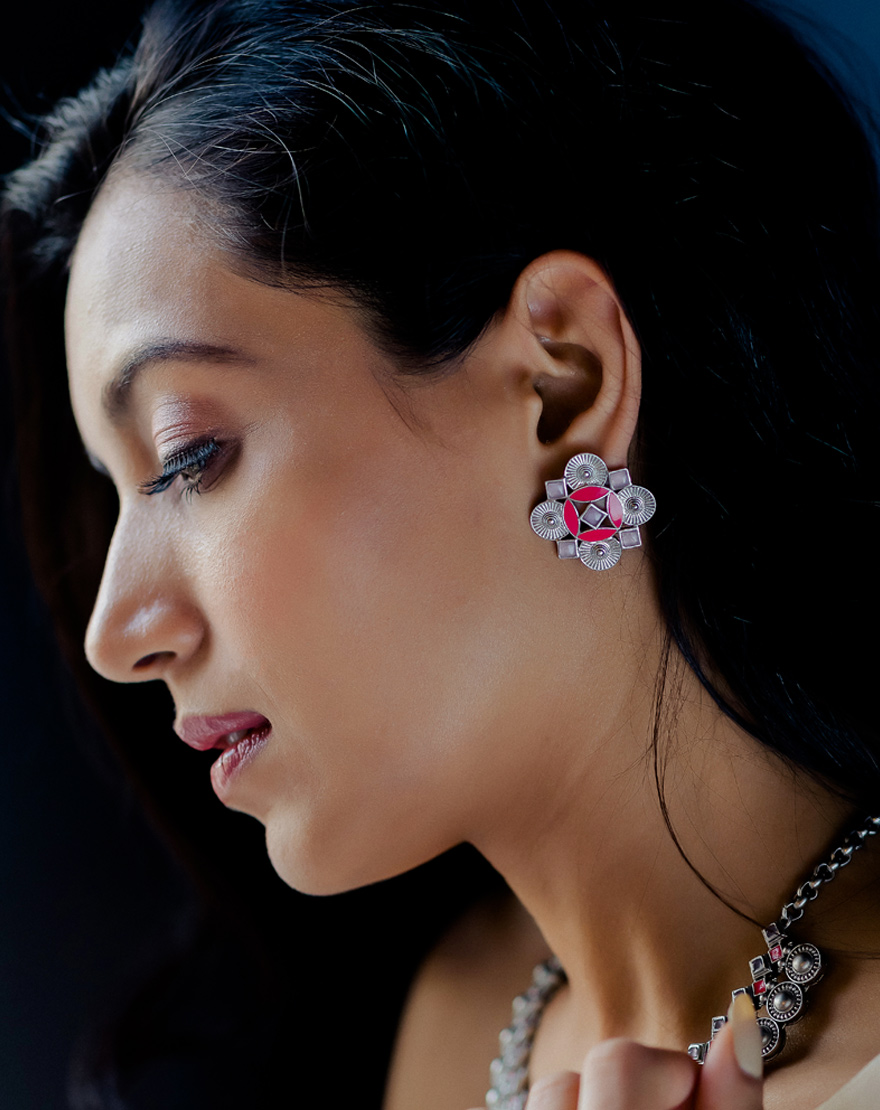 Alia Studs Pink Rose Quartz – These stunning pair of earrings are inspired from the architectural patterns found in the city of Marrakech (Morocco) handcrafted using silver plated brass with rose pink and carnation pink hand-painted enamel and Rose Quartz stones. These earrings are feather light in weight and a perfect pair of Indian Contemporary style.