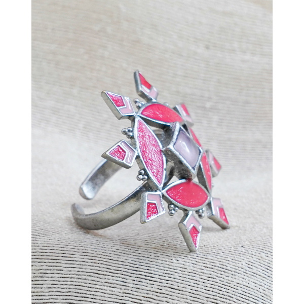 Aza Ring Pink Rose Quartz – This ring inspired from the architectural patterns found in the city of Marrakech (Morocco) handcrafted using silver plated brass, hand-painted carnation pink and rose pink enamel with rose quartz stones