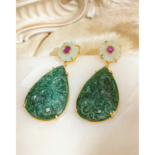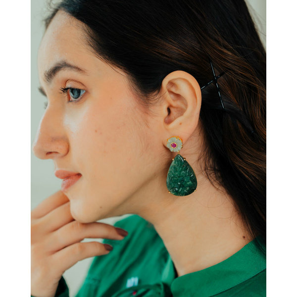 Bahaar Earrings is inspired from the Mughal Gardens and the beautiful flowers which are fully bloomed in the season of Spring. The beautiful stones in these earrings Green Strawberry Quartz and Green Aventurine stones are hand carved with floral motifs on it. Completing this earring with unique Moissanite stone, these earrings are perfect pair for this festive season.