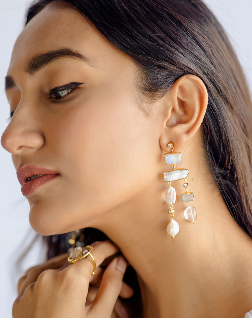 Bianca earrings are vision in white. Beautiful handcrafted earrings made using beautiful mixture of stones on gold plated recycled brass. This is a beautiful statement piece of earrings which will elevate your look.