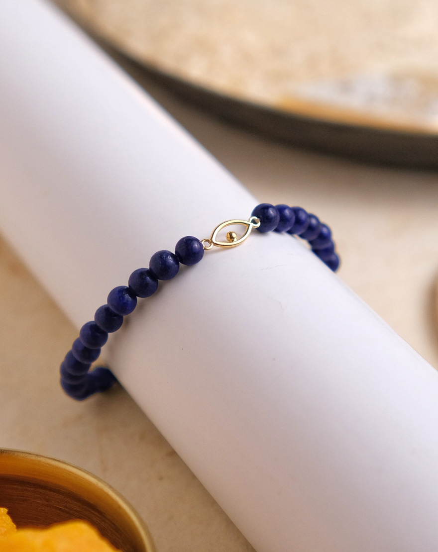 Evil Eye Rakhi Bracelet Unisex (medium) – This stretchable rakhi bracelet is handcrafted using hand made gold plated eye motif, with natural lapis lazuli beads around it. This is a gender neutral rakhi bracelet.