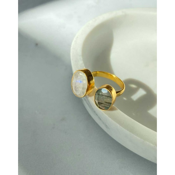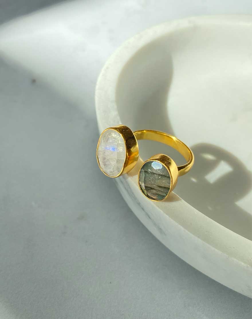 Gemma Ring – This beautiful handmade two stone ring is made using moonstone and labradorite on 1 micron gold plated brass. Perfect ring for monochrome lovers.