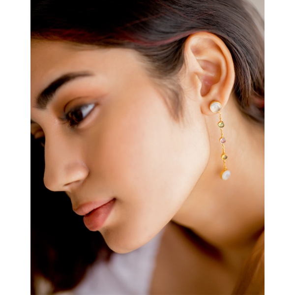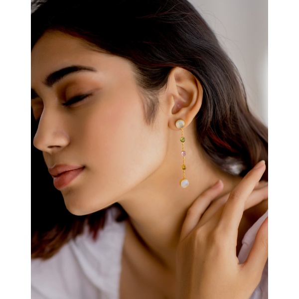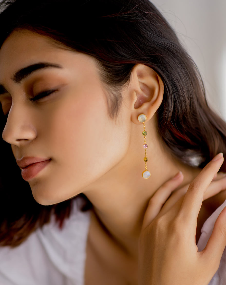 Gracie Earrings Pastel – These super delicate earrings are handmade using a combination of beautiful stones such as moonstone, peridot, pink tourmaline, citrine with 18k gold on brass.