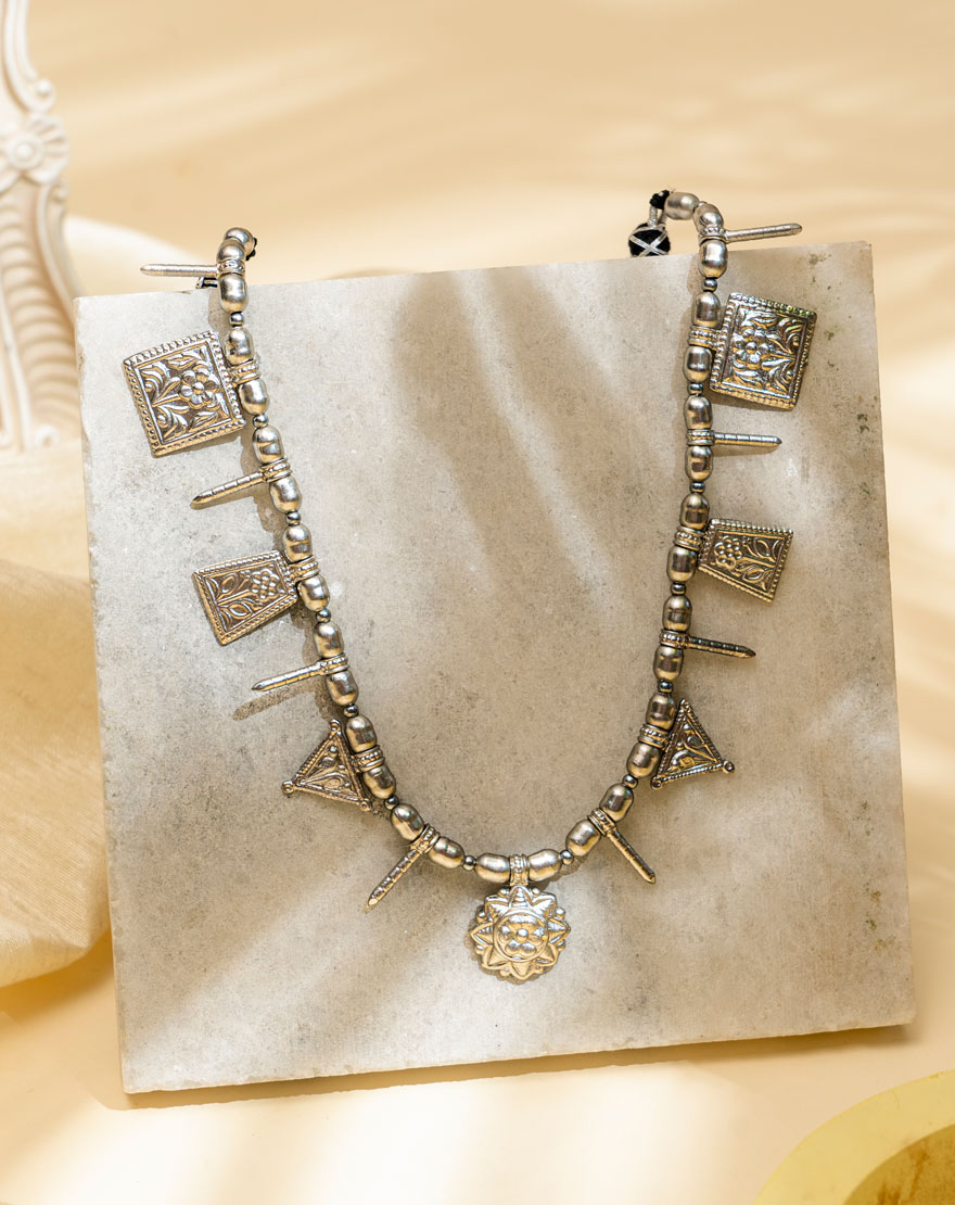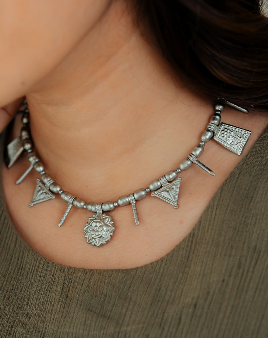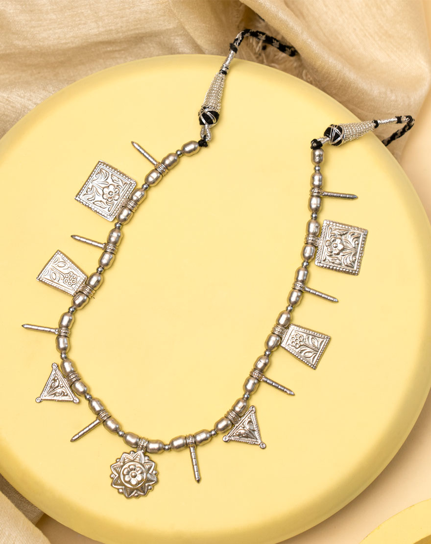 This statement making silver tribal necklace is inspired from different floral motifs painted on on Jaipur’s palace walls. This necklace is made on silver plated recycled brass. This necklace has a thread closure with a bead which can help in adjusting lengths.
