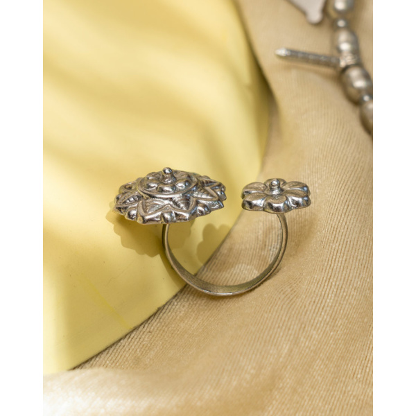 Gul mean flower in Persia. This stunning dual motif ring is inspired from the beautiful floral motifs painted on Jaipur’s Palace Walls. This ring is made using silver plated recycled brass.