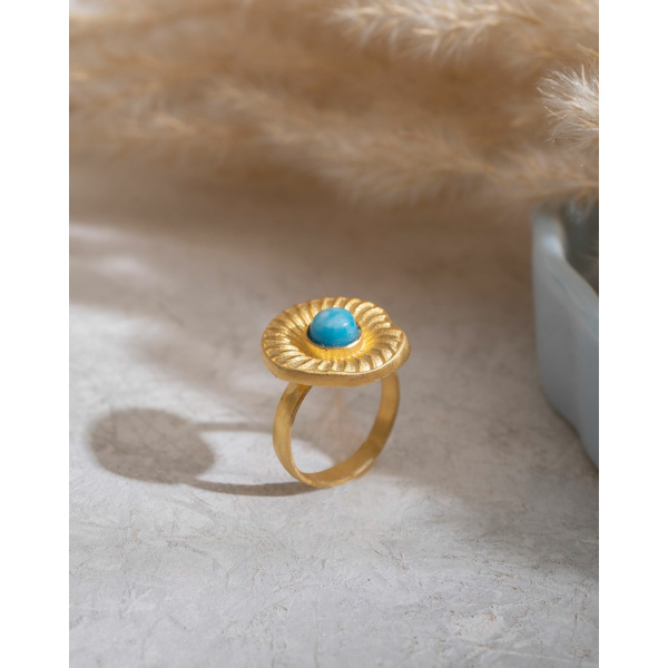 Kai means Sea in Hawaiian language. The lining on the ring depicts waves in the sea and the larimar stone is the beautiful color of the sea. Handcrafted using 18k gold plated recycled brass with natural larimar stone this ring is 100% adjustable.