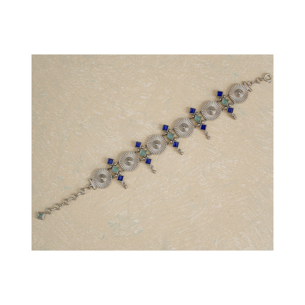 Lara Bracelet Blue Aqua Chalcedony – This beautiful bracelet is inspired from the architectural patterns found in the city of Marrakech (Morocco) handcrafted using silver plated brass with sky blue and lapis blue enamel with Aqua Chalcedony stones. This bracelet is adjustable in size and will fit almost all sizes.