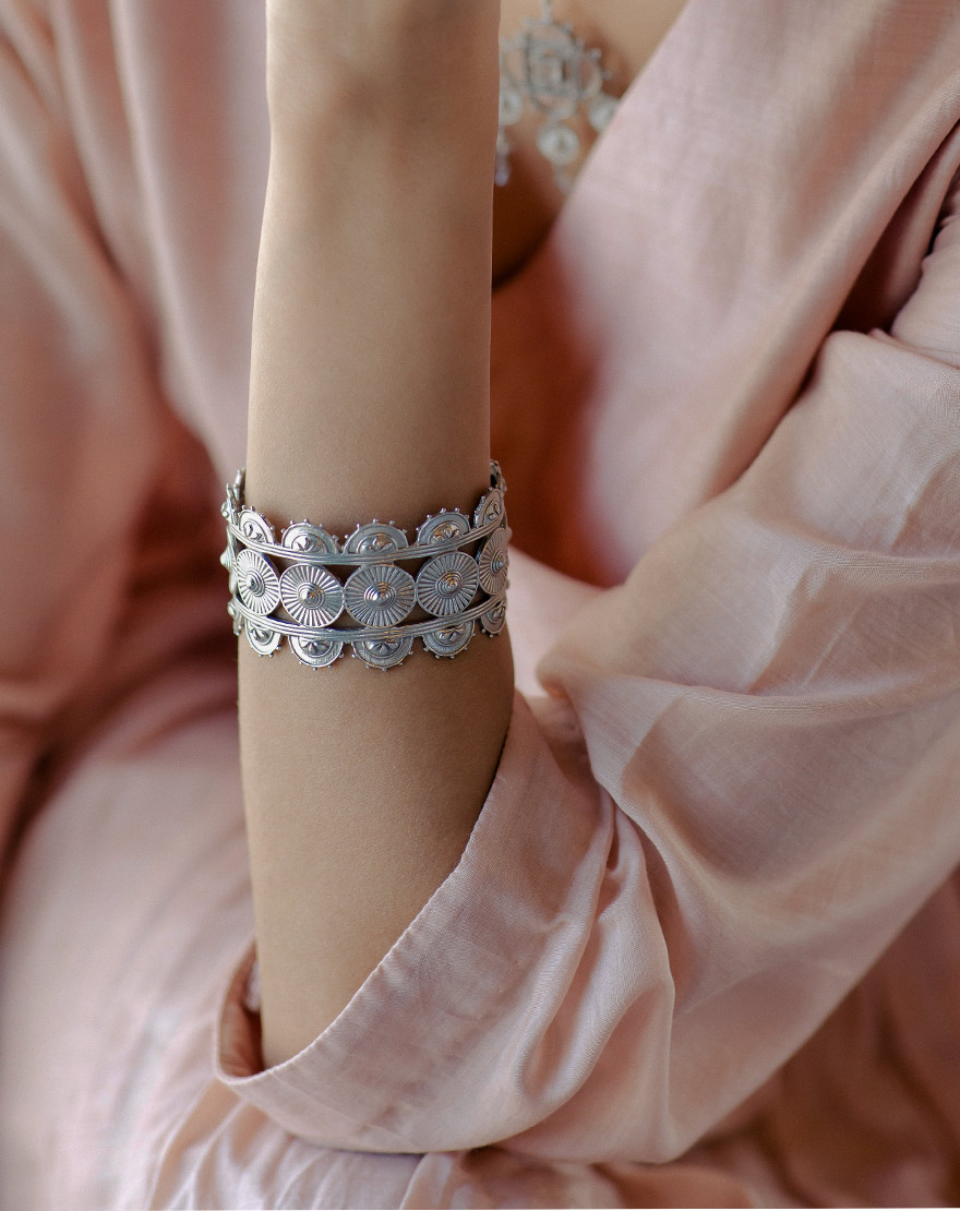 Lara Cuff Silver – This stunning statement making cuff is inspired from the architectural patterns found in the city of Marrakech (Morocco) handcrafted using silver plated brass and beautiful moroccan patterns all over the cuff.