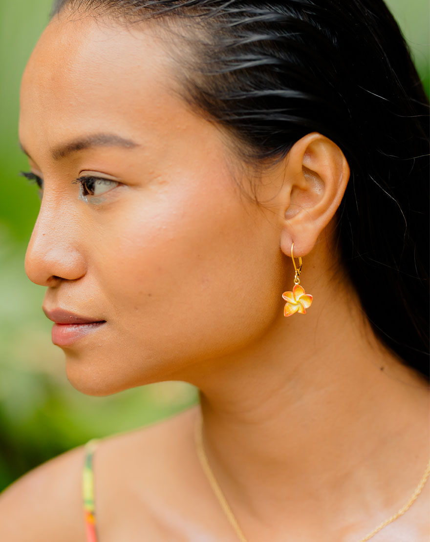 Leilani means heavenly flower in Hawaiian language. These earrings are inspired from Plumeria flower which are found widely in Hawaii. They have the sweetest fragrance with gorgeous shades. These earrings are handcrafted using 18k gold plated brass and are hand painted with the colors as seen on plumeria flowers.
