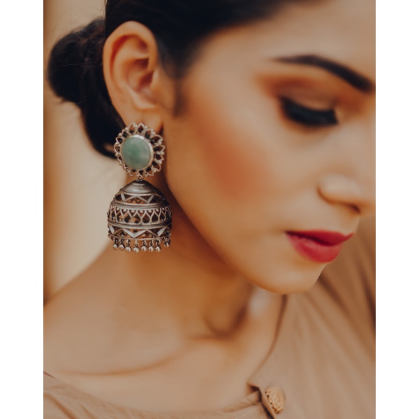 Nakshi Earrings : These are from Silver Bloom Collection. Handcrafted statement jhumkas using silver plated brass with green aventurine stone, intricate details and crafted to perfection.