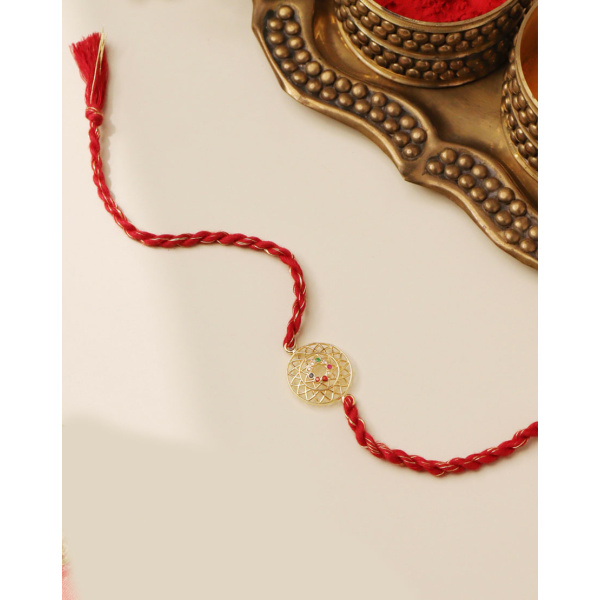 This beautiful rakhi is inspired from the Mandala art and handcrafted using navratna gemstones which are know to balance energies and bring good fortune to the wearer. Hand made using 18k gold plated brass with gemstones, red and gold organic cotton threads.