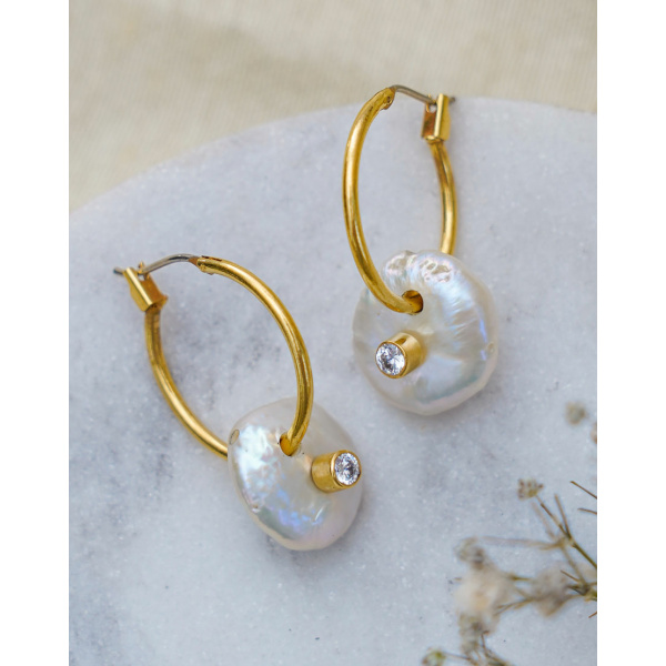Paloma Hoops redefines elegance! Handcrafted using recycled brass on 18k gold plating with button pearls and CZ studded in it. Perfect for workwear, day wear or for brunch look.