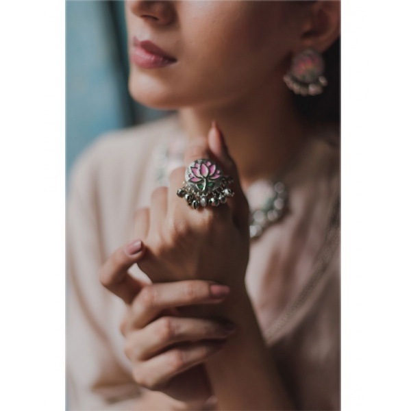 Pink Silver Lotus Ring : Handcrafted silver ring inspired from “Pichwai” motifs, with hand-painted enamel.