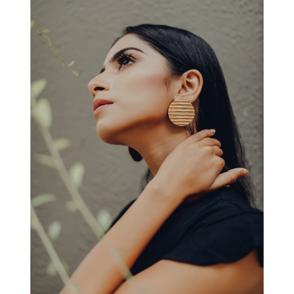 Raw Circle Studs (Gold) : Handcrafted statement with lineared texture on gold plated brass giving it a bold and raw look. Made in India.