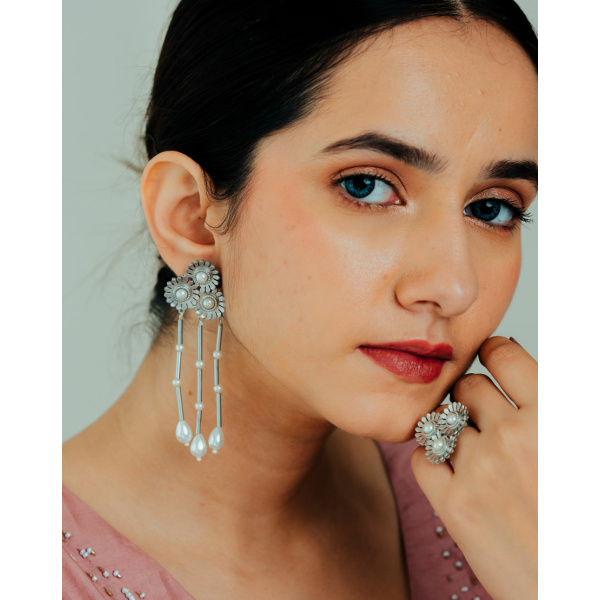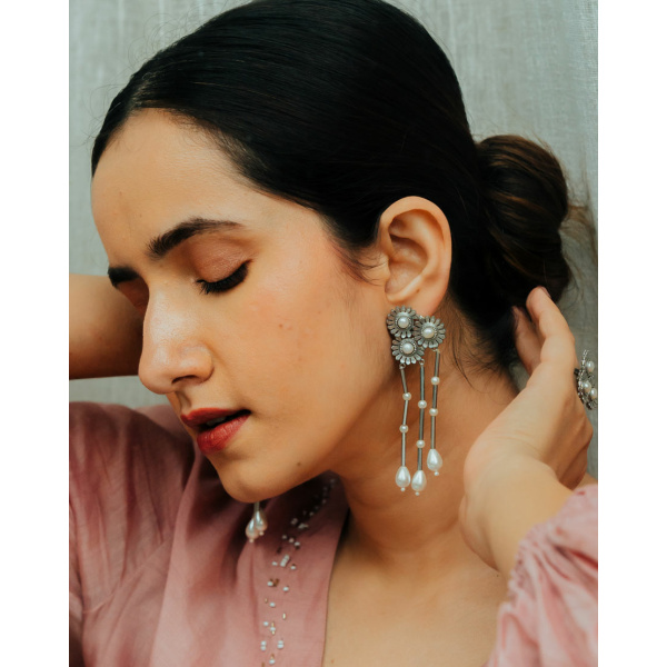 Seher Earrings are beautifully handcrafted using silver plated brass and different shapes of fresh water pearls. With stunning waterfall tassels these earrings gives drama to your look. Pair it with western or Indian outfits, these earrings will go anything and everything.