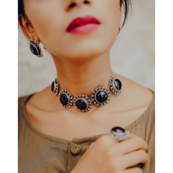 Silver Bloom Choker – Onyx : Statemenr making choker handcrafted using finest quality of onyx stones set in the floral inspired motifs on silver plated brass.