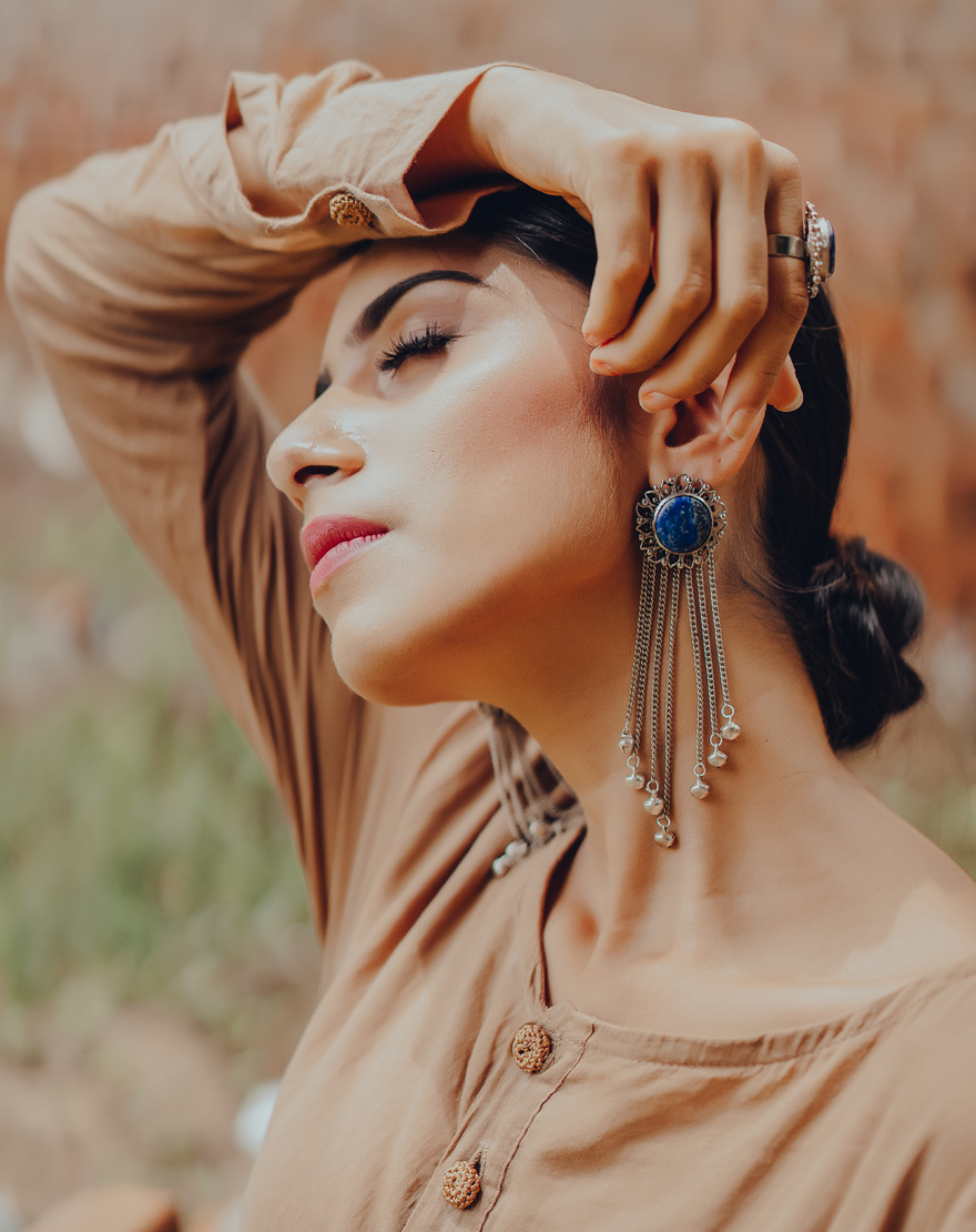 Silver Bloom Tassels – Lapis Lazuli : Handcrafted statement making tassels earrings made using lapis lazuli stone on silver plated metal.
