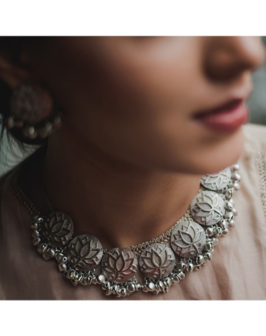 Silver Lotus Choker + Studs and Ring Combo : Handcrafted silver lotus studs with picchwai motifs and ghunghroos with silver lotus ring and statement choker, buy as a combo and get at discounted price.