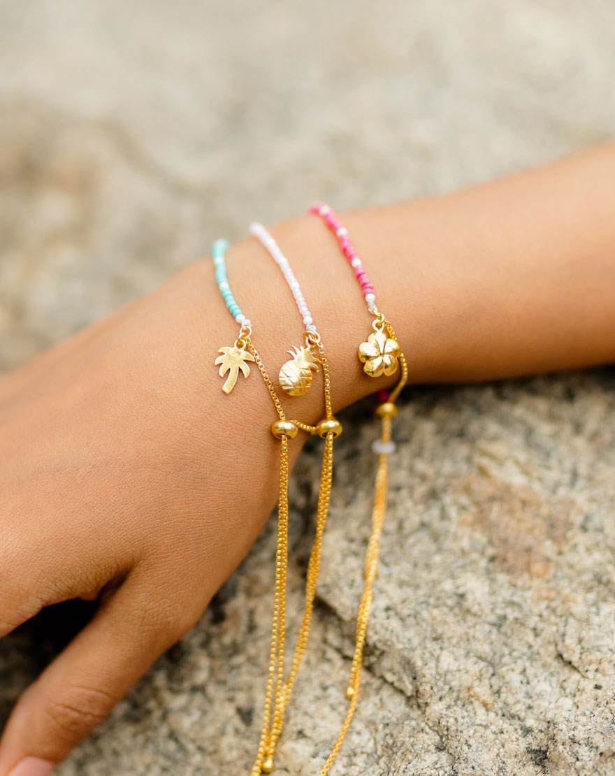 This stunning combo of colorful seed beads bracelet is perfect for your vacation looks and/or Spring Summer outfits. These bracelets are adjustable and can fit almost all sizes. Each bracelet has a cute charm attach to it reminding of the beach vacation. They come in a set of 3 (baby pink, hot pink and turquoise seed beads with flower, pineapple and a palm tree charm attached to it)