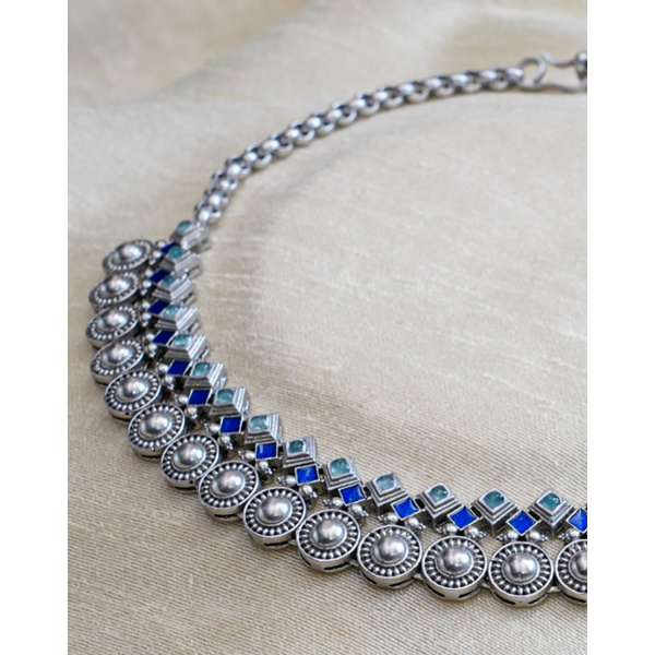 Zara Choker Blue Aqua Chalcedony – This stunning statement making choker necklace is inspired from the architectural patterns found in the city of Marrakech (Morocco) handcrafted using silver plated brass with lapis blue enamel and Aqua Chalcedony stones. This is beautiful choker has so many detailed elements which all together will be must have choker in your jewelry box.