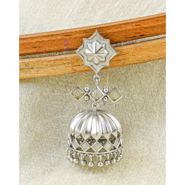 Zara Jhumkis Crystal Quartz – These stunning pair of earrings are inspired from the architectural patterns found in the city of Marrakech (Morocco) handcrafted using silver plated brass with Clear Quartz stones. These earrings are feather light in weight and a perfect pair of Indian Contemporary style.
