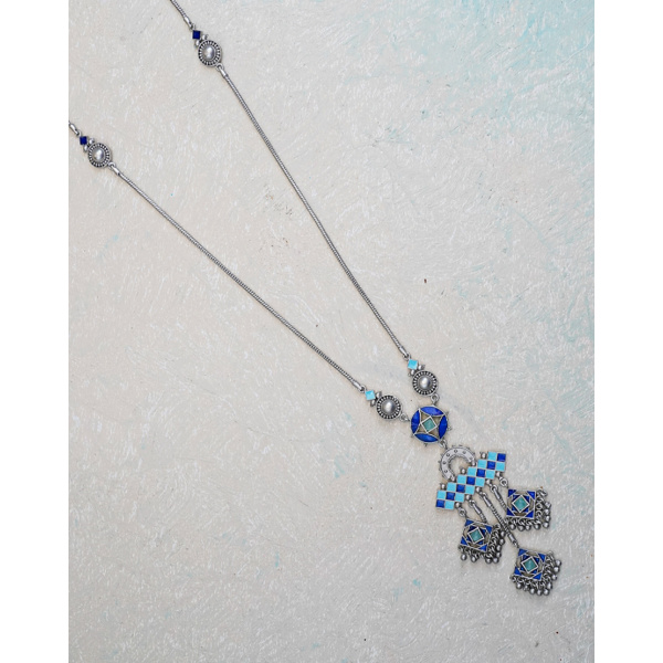 Zeba Long Necklace Blue – This beautiful necklace is inspired from the architectural patterns found in the city of Marrakech (Morocco) handcrafted using silver plated brass with sky blue and lapis blue enamel with Aqua Chalcedony stones. This necklace is 25 inches long and you can pair it up with all of your dresses.