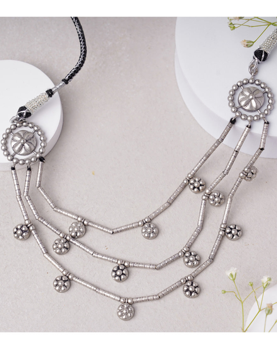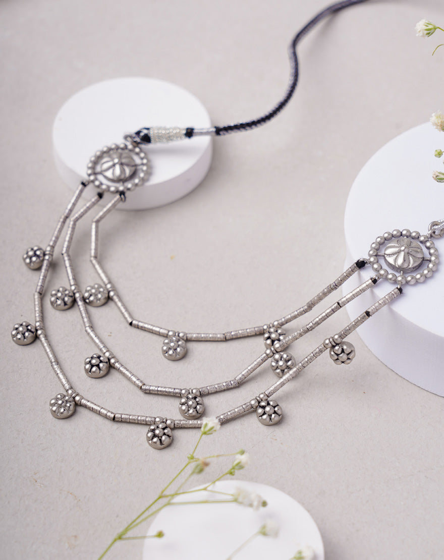 Aadya, named after goddess Durga, showcases delicate beadwork and motifs inspired by the captivating antique doors found in India's historical landmarks. Elevate your style with this adjustable choker, meticulously handcrafted from gunmetal-colored silver-finished brass.