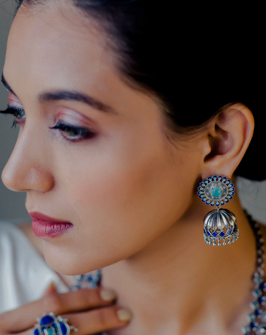Aisha Jhumkis Blue Aqua Chalcedony – These stunning pair of earrings are inspired from the architectural patterns found in the city of Marrakech (Morocco) handcrafted using silver plated brass with sky blue and lapis blue enamel and Aqua Chalcedony stones. These earrings are feather light in weight and a perfect pair of Indian Contemporary style.
