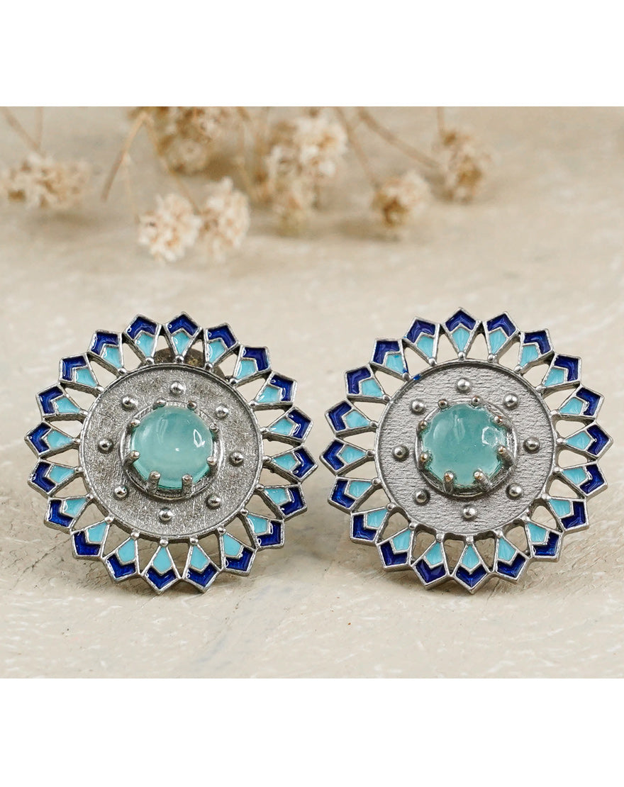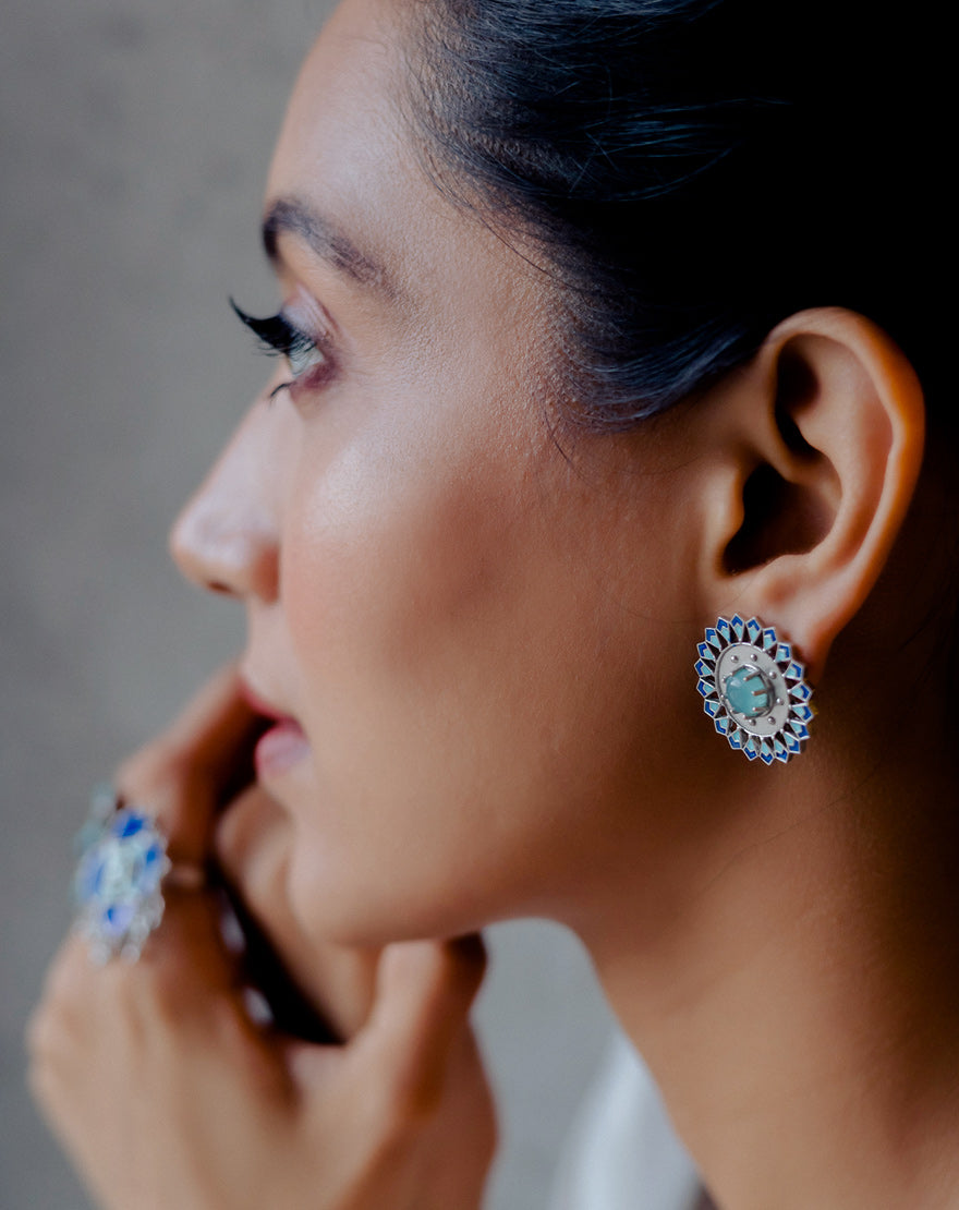 Aisha Studs Blue Aqua Chalcedony – These stunning pair of earrings are inspired from the architectural patterns found in the city of Marrakech (Morocco) handcrafted using silver plated brass with sky blue and lapis blue enamel with Aqua Chalcedony stones. These earrings are feather light in weight and a perfect pair of Indian Contemporary style.