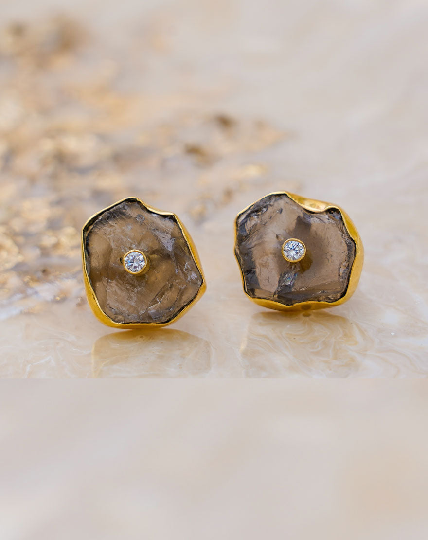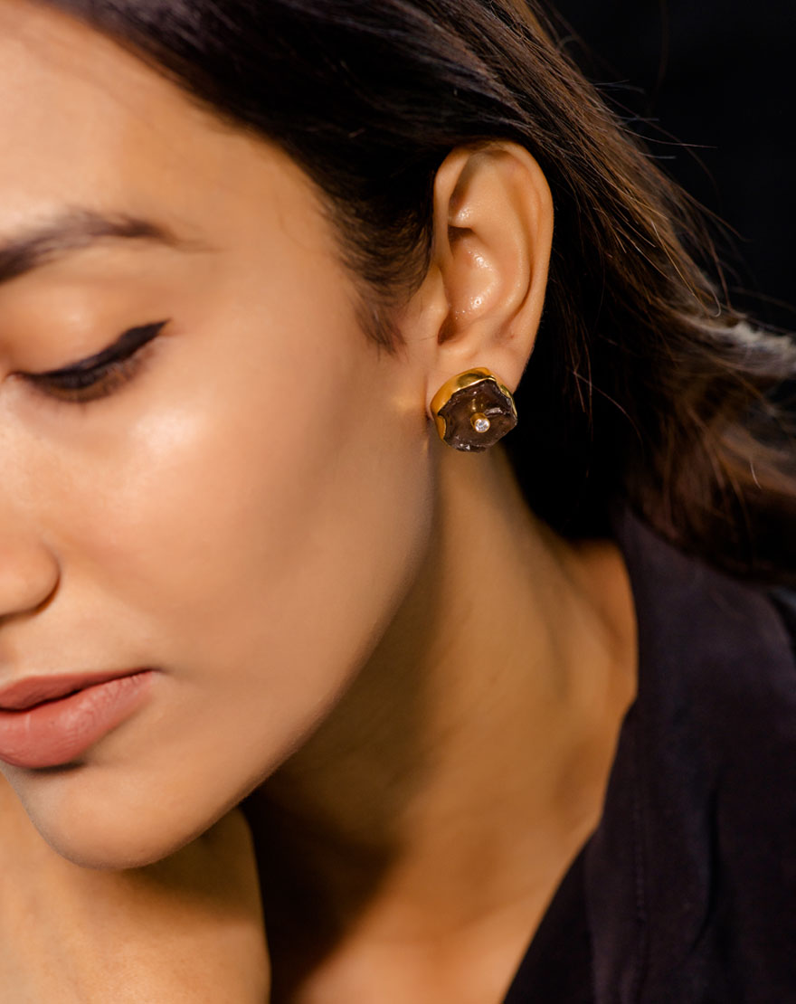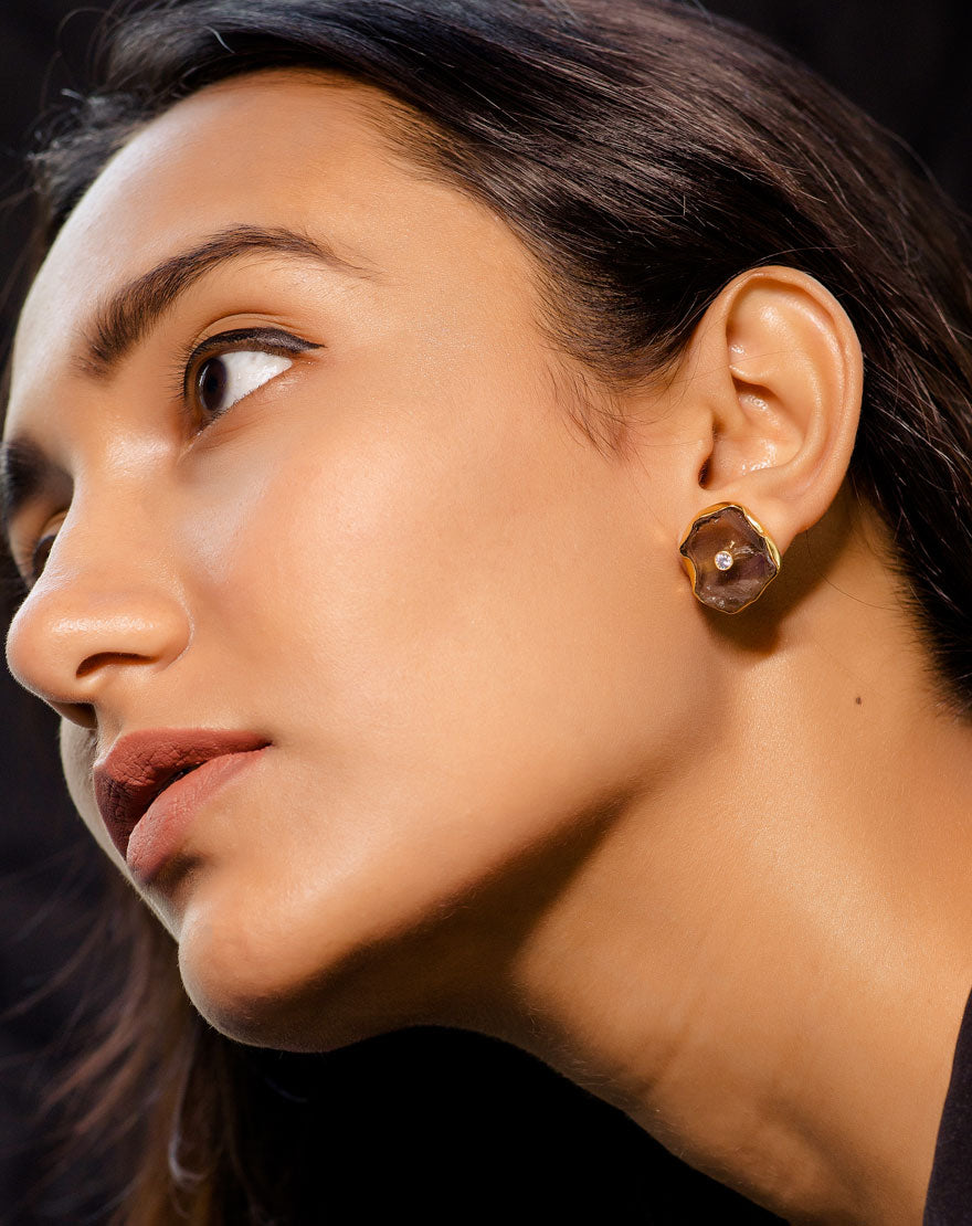 These dainty but statement making studs are handcrafted using 18k gold plated recycled brass with Grey Smokey Quartz stone. You can styles these studs in multiple ways and are must haves for your wardrobe.