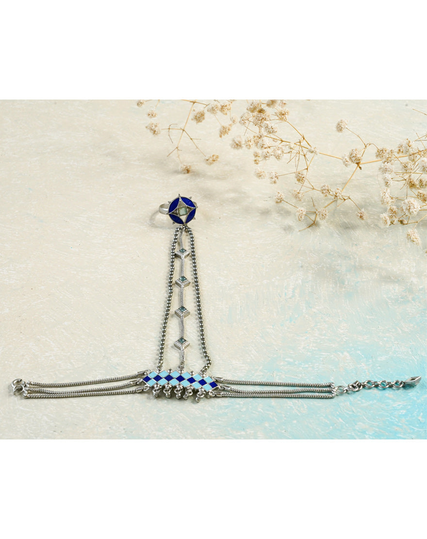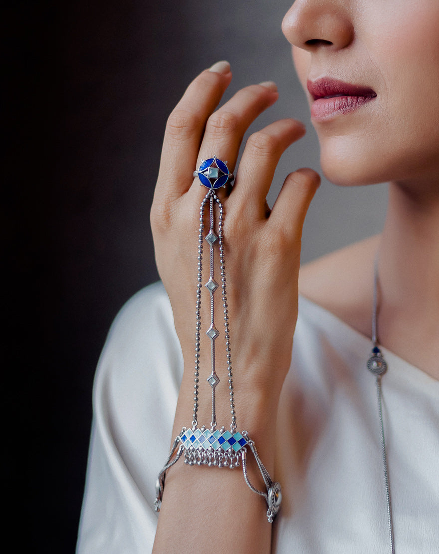 Alia Haath Phool Blue – This beautiful haath phool (ring – bracelet) is inspired from the architectural patterns found in the city of Marrakech (Morocco) handcrafted using silver plated brass with sky blue and lapis blue enamel with Aqua Chalcedony stones. The ring and the the bracelet attached to it are adjustable and will fit almost all sizes.