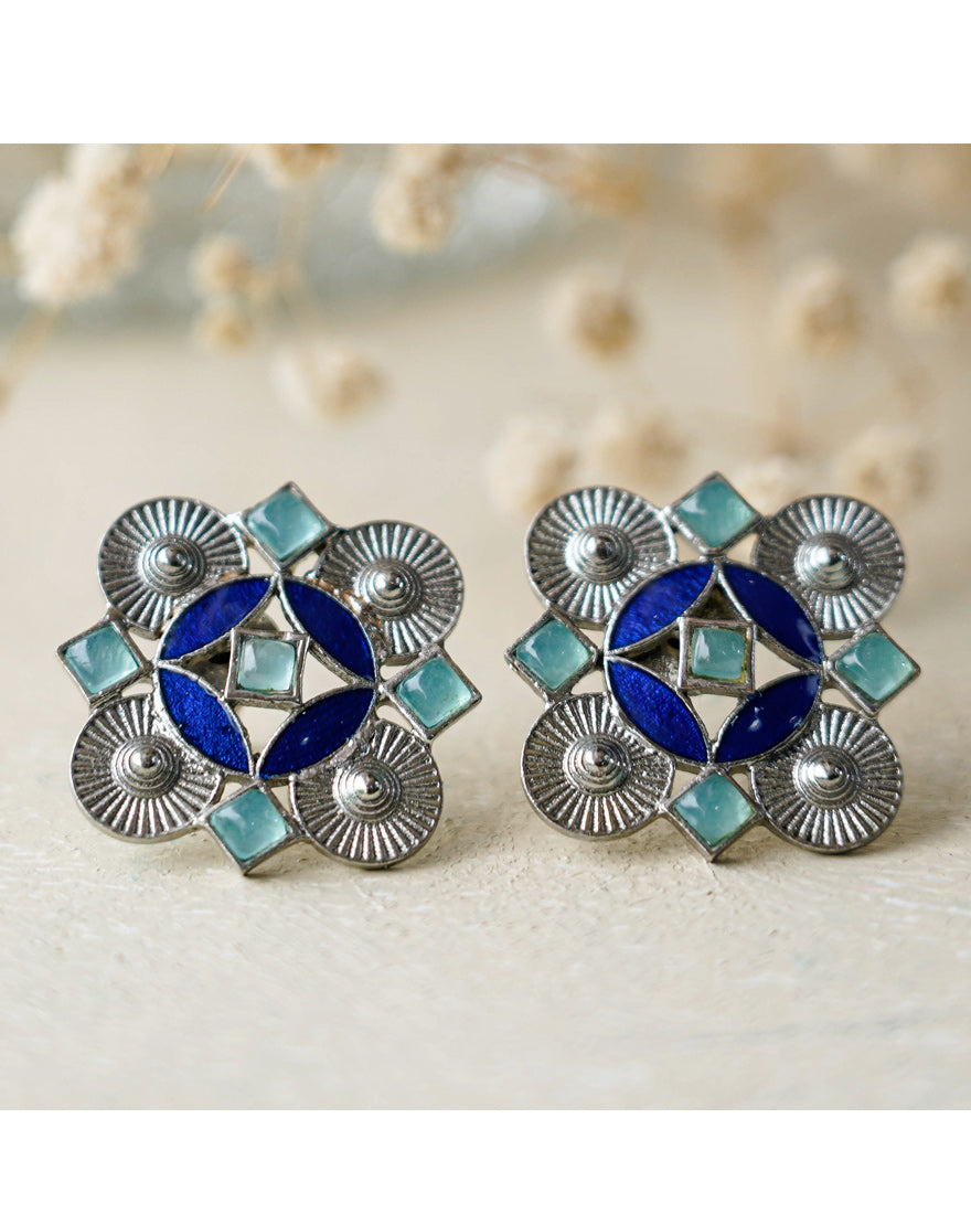 Alia Studs Blue Aqua Chalcedony – These stunning pair of earrings are inspired from the architectural patterns found in the city of Marrakech (Morocco) handcrafted using silver plated brass with sky blue and lapis blue enamel with Aqua Chalcedony stones. These earrings are feather light in weight and a perfect pair of Indian Contemporary style.