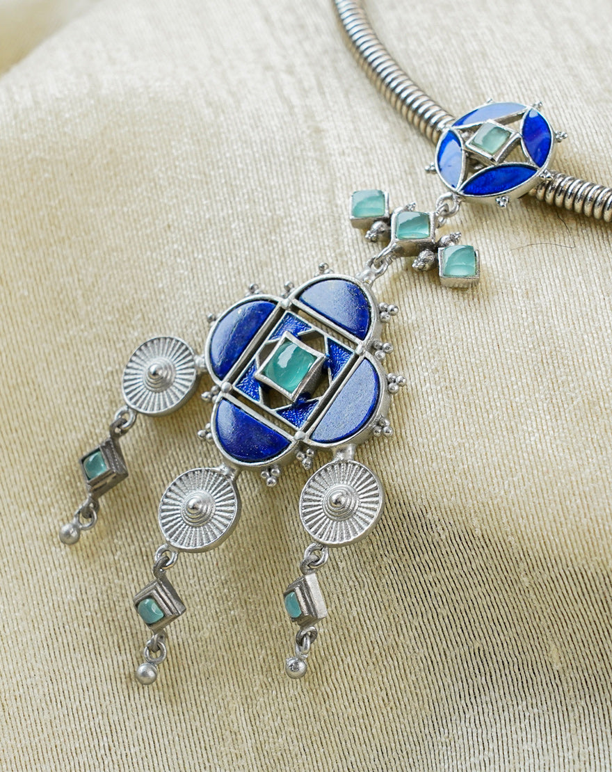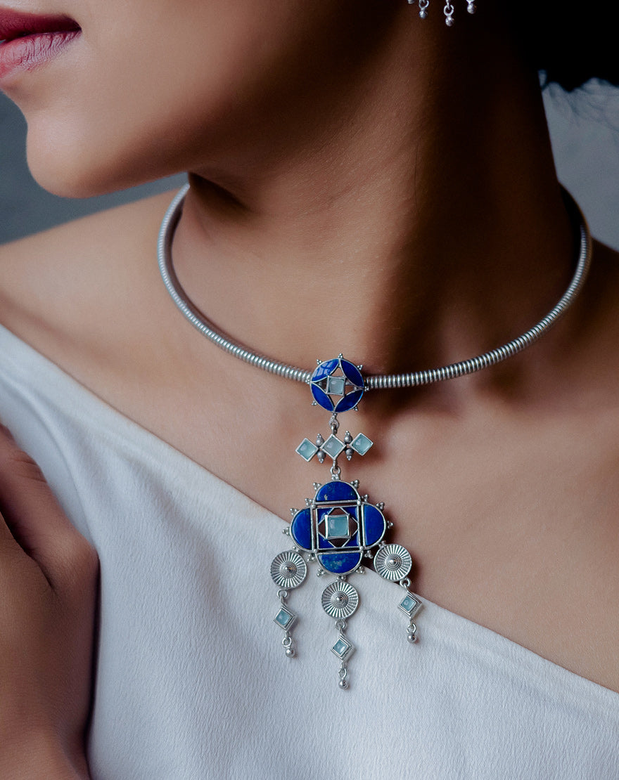 Aneesa Hasli Necklace Blue – This stunning statement making Hasli (adjustable collarbone necklace) is inspired from the architectural patterns found in the city of Marrakech (Morocco) handcrafted using silver plated brass with lapis blue enamel, Aqua Chalcedony stones and Lapis Lazuli stones. This is our take on the traditional Hasli necklaces combining beautiful moroccan patterns in a contemporary design.