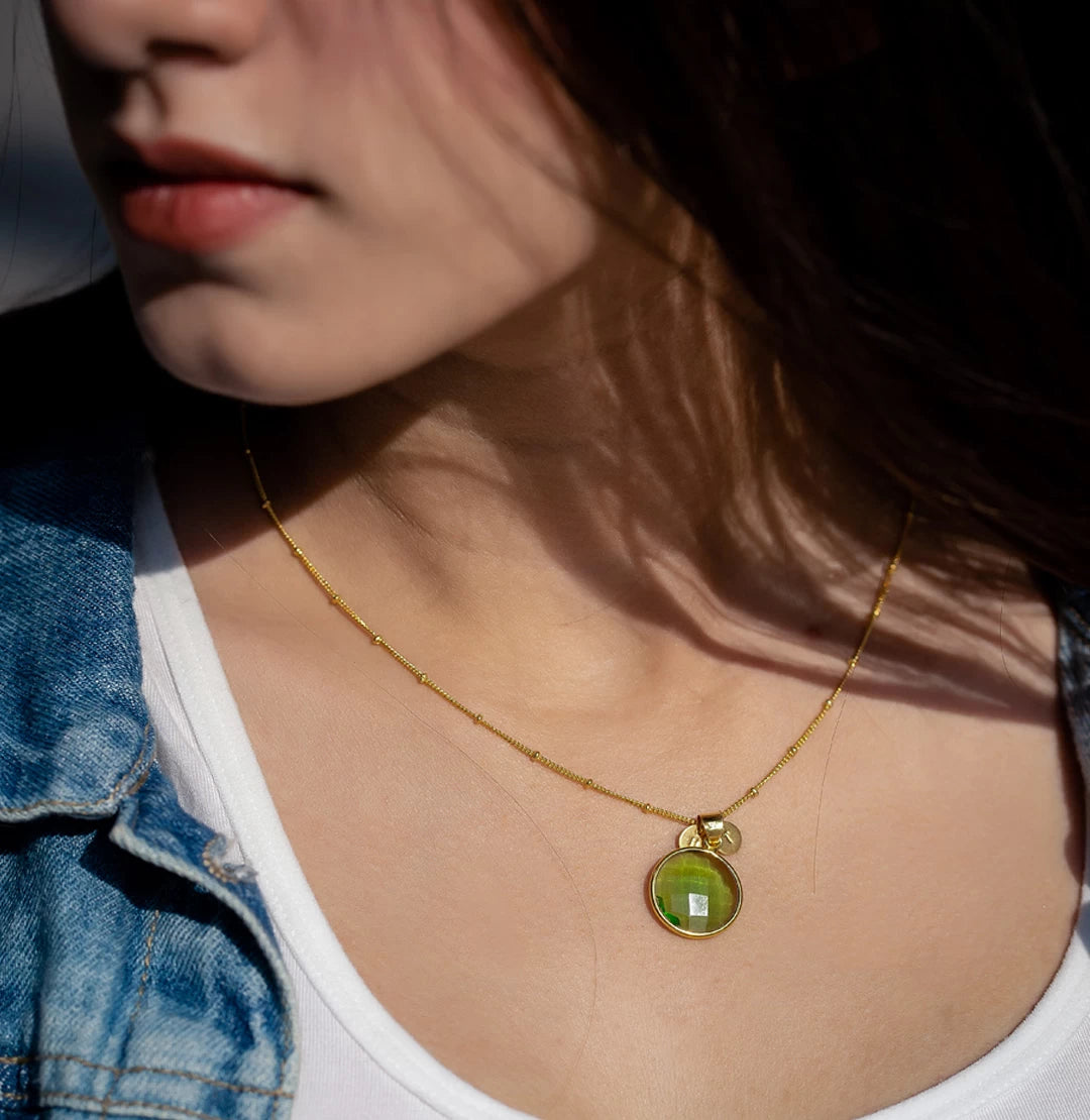 Handcrafted necklace made out of Peridot stone in 925 pure silver and 18k gold plating. You can personalize it by adding two initials in the necklace. A perfect gift to someone you love or yourself.