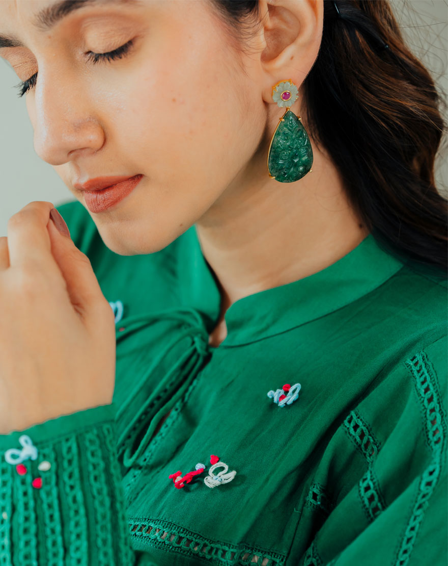 Bahaar Earrings is inspired from the Mughal Gardens and the beautiful flowers which are fully bloomed in the season of Spring. The beautiful stones in these earrings Green Strawberry Quartz and Green Aventurine stones are hand carved with floral motifs on it. Completing this earring with unique Moissanite stone, these earrings are perfect pair for this festive season.