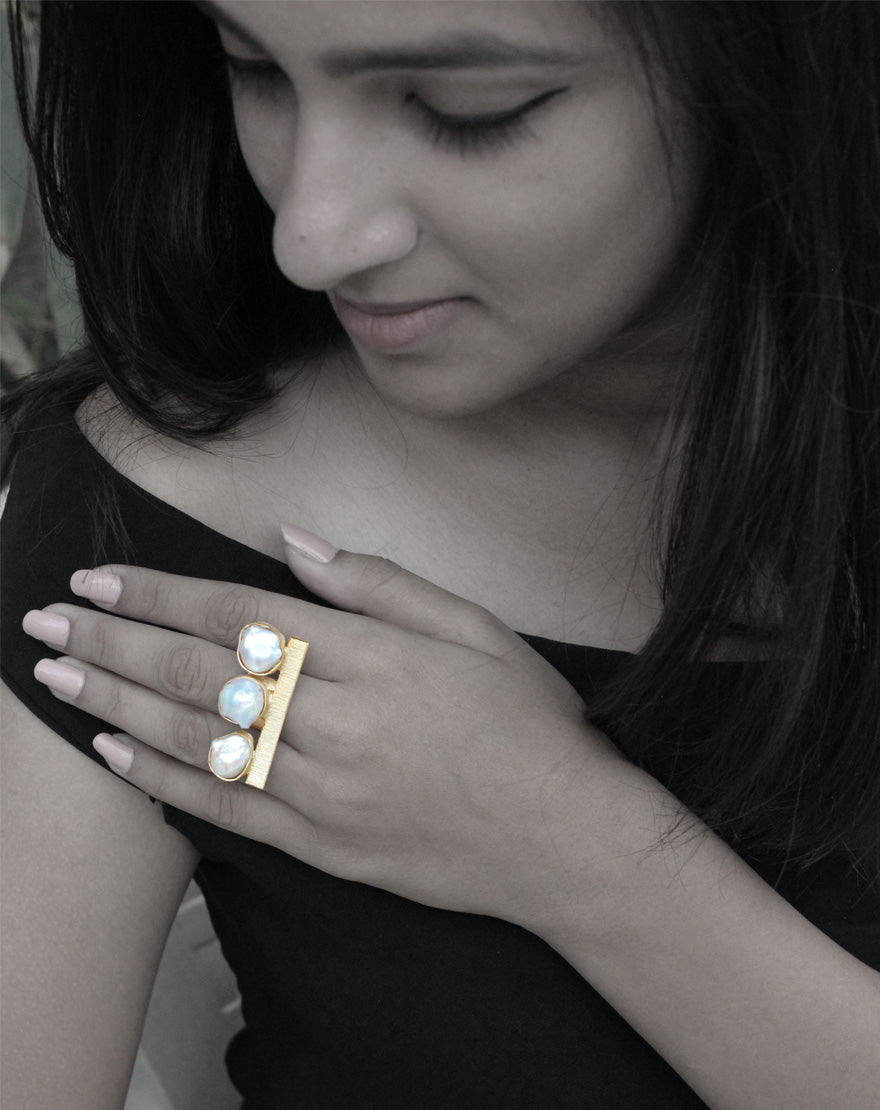 Barroco Ring : Handcrafted ring using freshwater Baroque pearls on a gold plated brass textured sheet, which is statement making yet elegant.