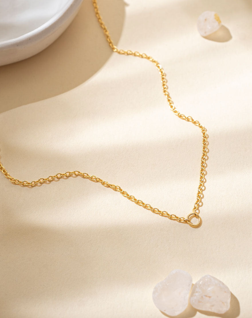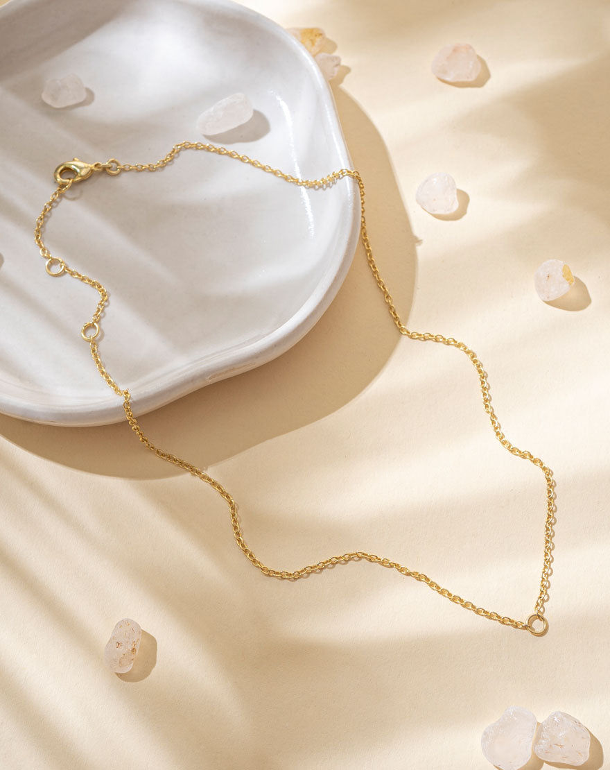 This basic cable chain necklace is a staple for your jewelry box. You can pair it with any of our charms from the Aloha collection or just wear it as it is. It has adjustable lengths. You can wear this necklace at 15/16/17 inches length, necklace extender is attached with the necklace. Handcrafted using 18k gold plated recycled brass.