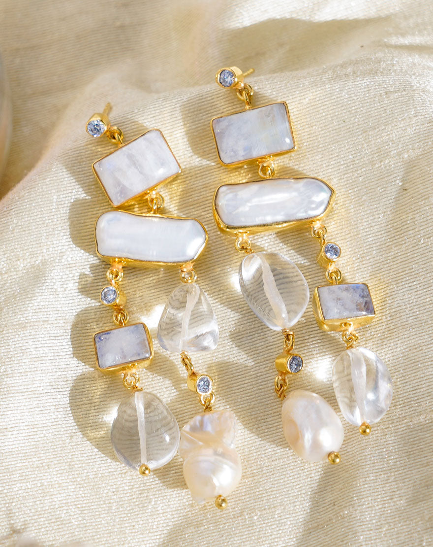 Bianca earrings are vision in white. Beautiful handcrafted earrings made using beautiful mixture of stones on gold plated recycled brass. This is a beautiful statement piece of earrings which will elevate your look.