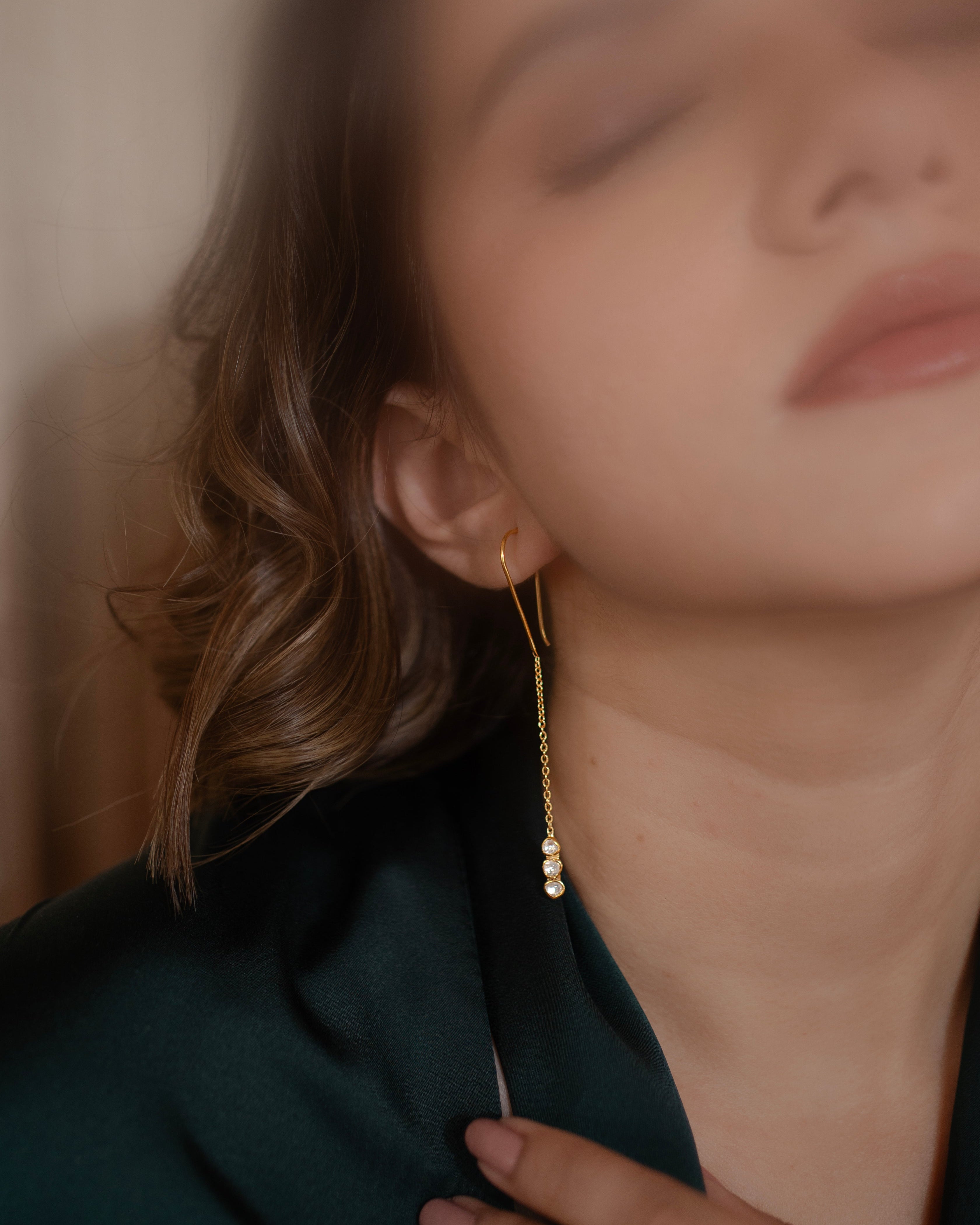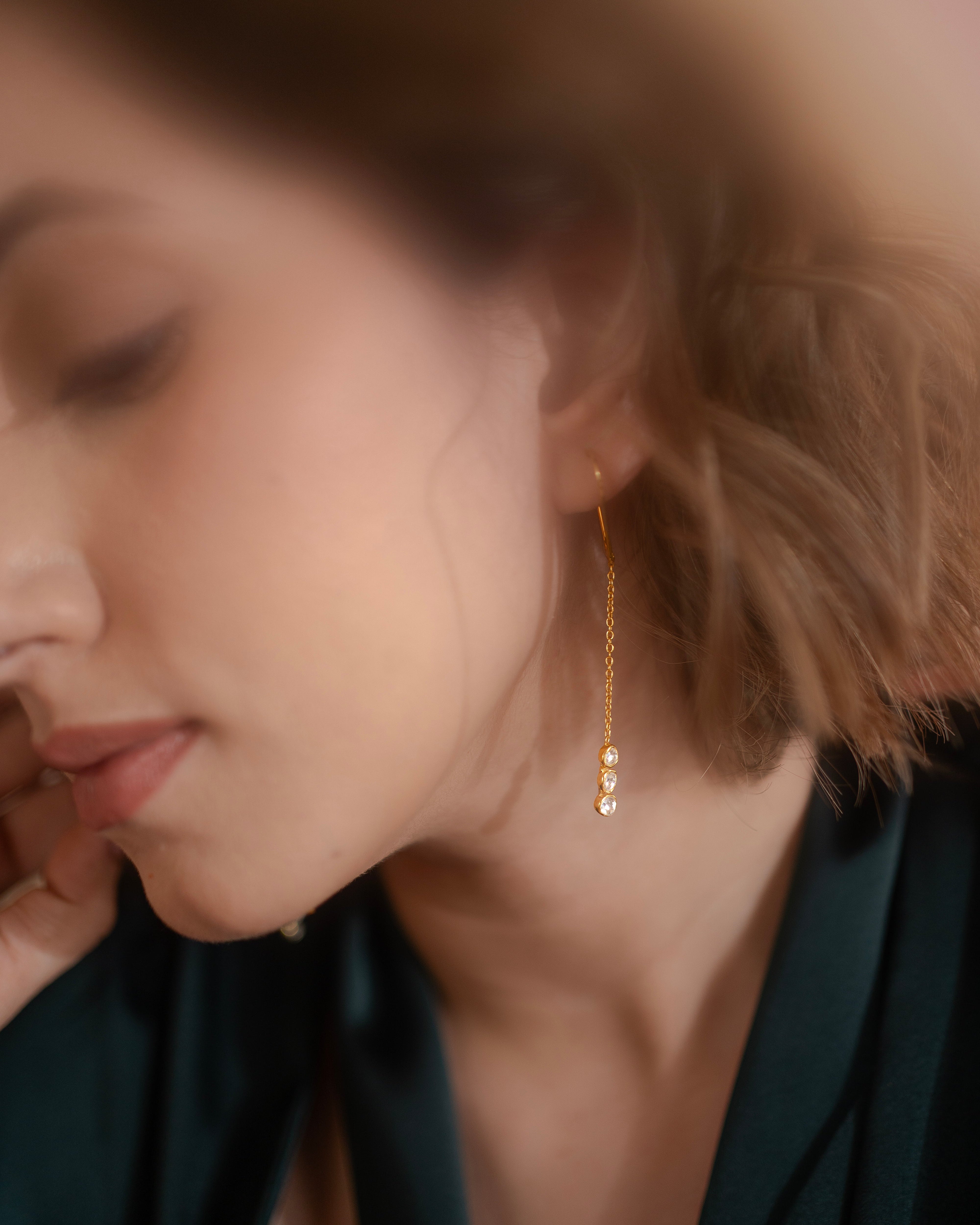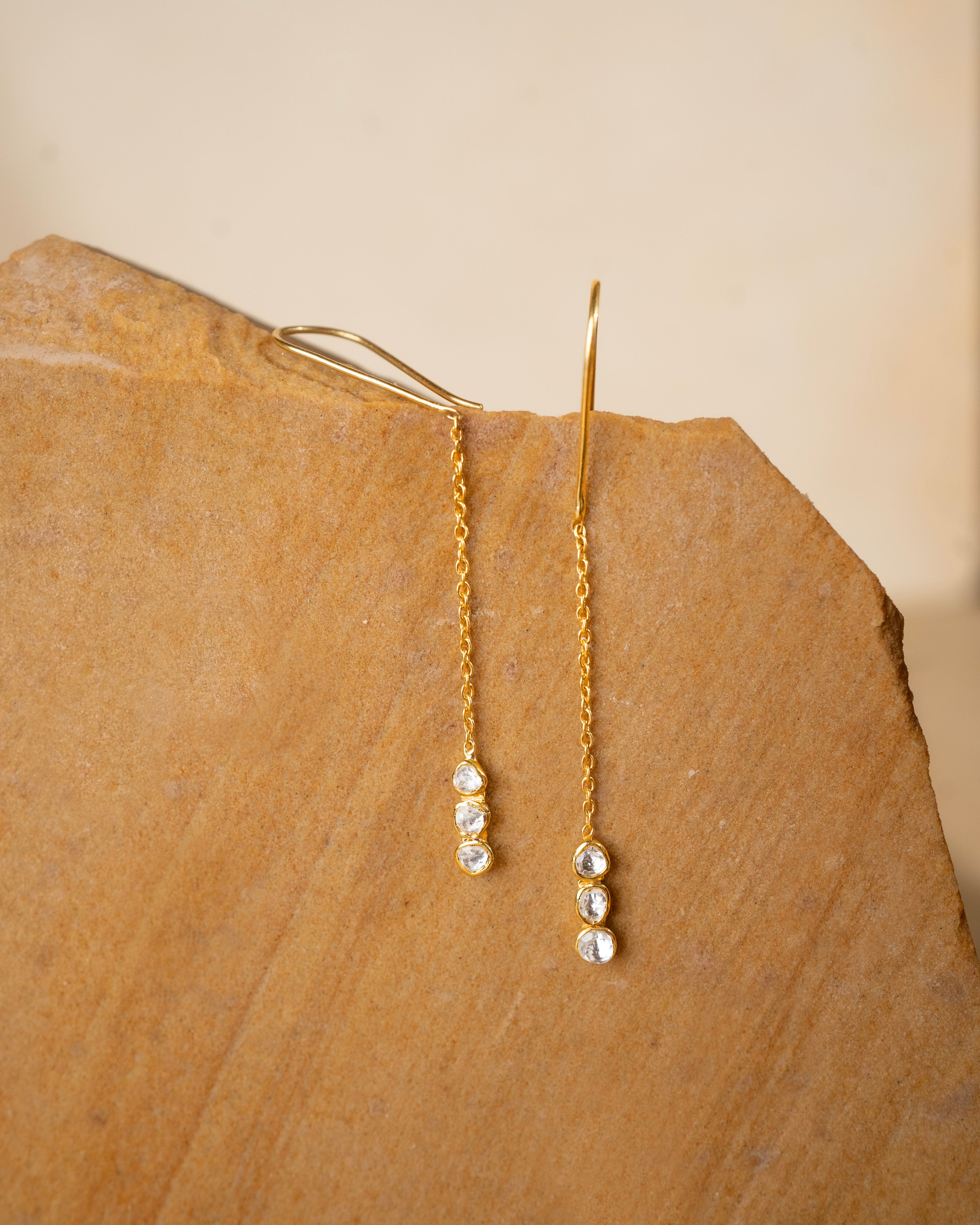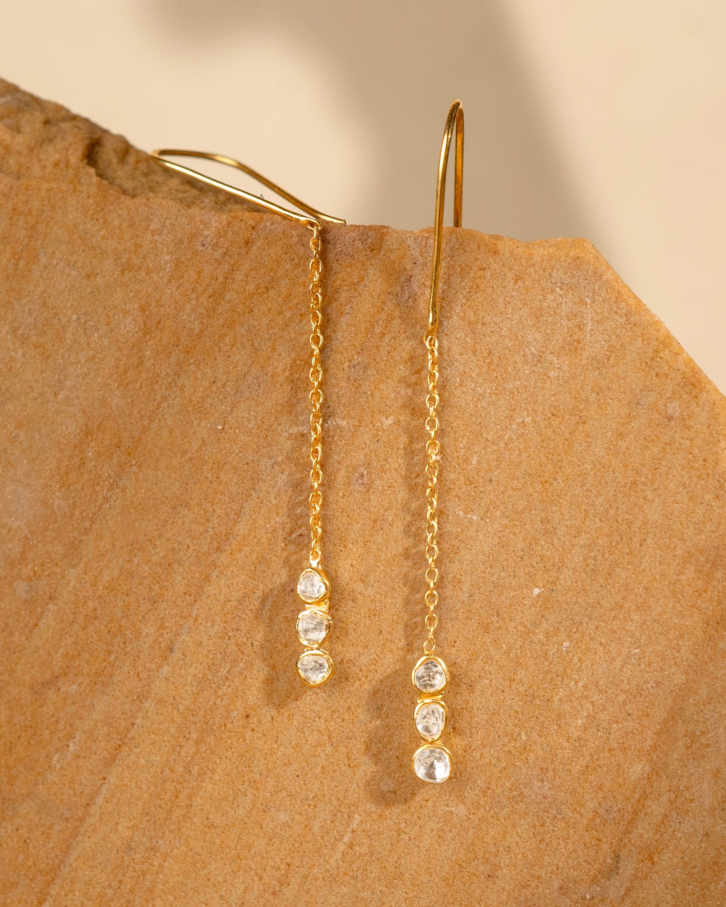 Light as air and endlessly graceful, the Celeste Earrings are designed to dance with you — catching the light with every subtle movement. Three bezel-set uncut moissanite stones are delicately strung on fine gold chains, creating a soft cascade that gently grazes the jawline.