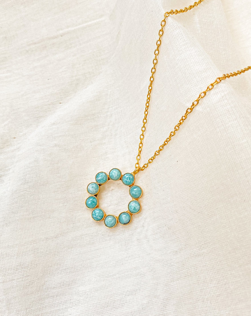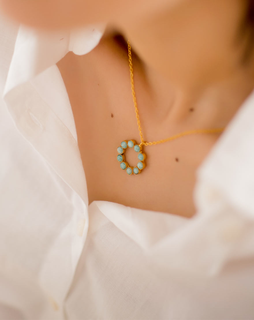 Chloe means blossom. This beautiful and dainty necklace is handmade using finest aquamarine agate which is feather light in weight on 18k gold plated brass.