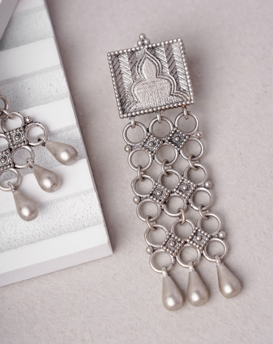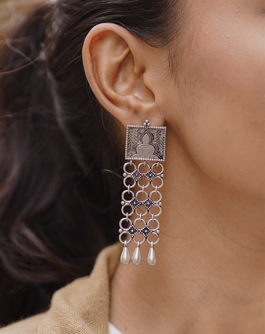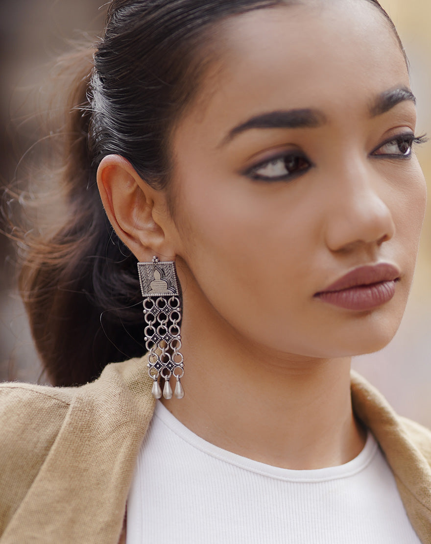 These stunning ‘Devi’ danglers draw inspiration from the intricate details of ancient Indian doors found in palaces and monuments, perfect for the goddess within you. Crafted from gunmetal-colored silver-finished brass.