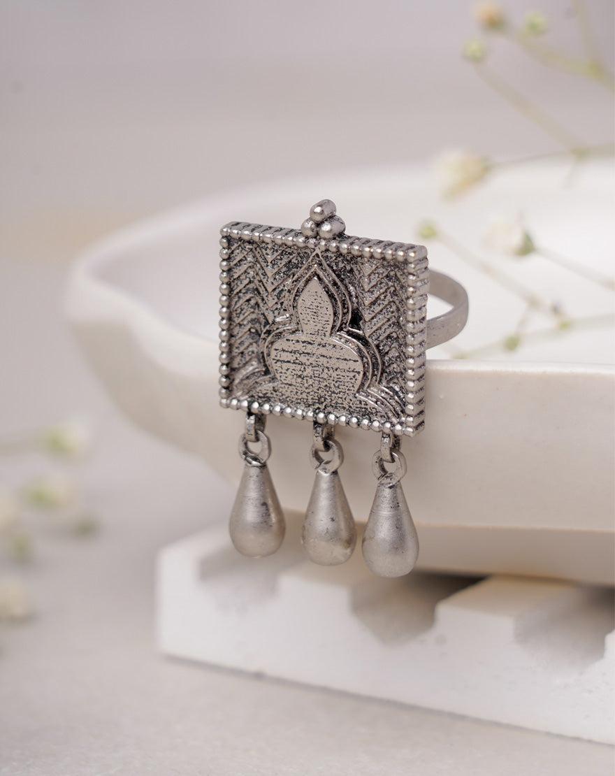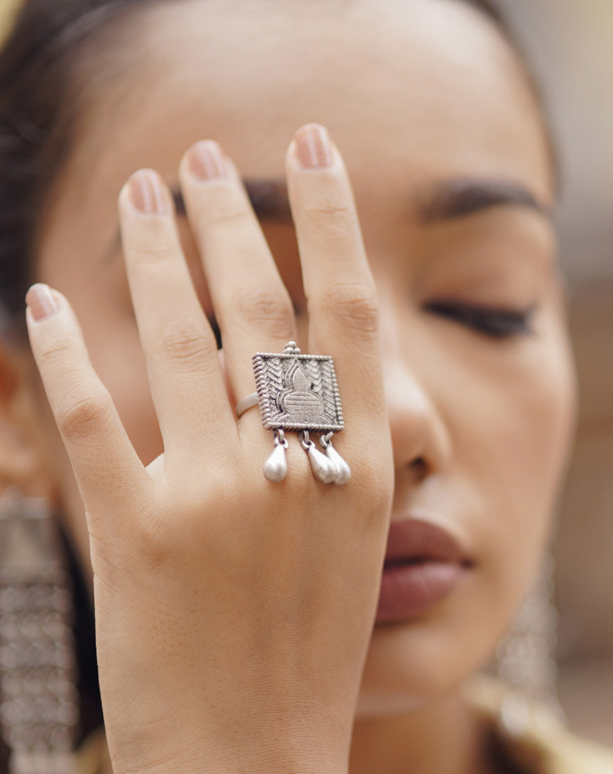 This stunning ‘Devi’ ring celebrates the goddess within you and captures the essence of antique door craftsmanship. An adjustable band ring crafted from gunmetal-colored silver-finished brass, showcasing intricate details inspired by India’s historic palace doors.