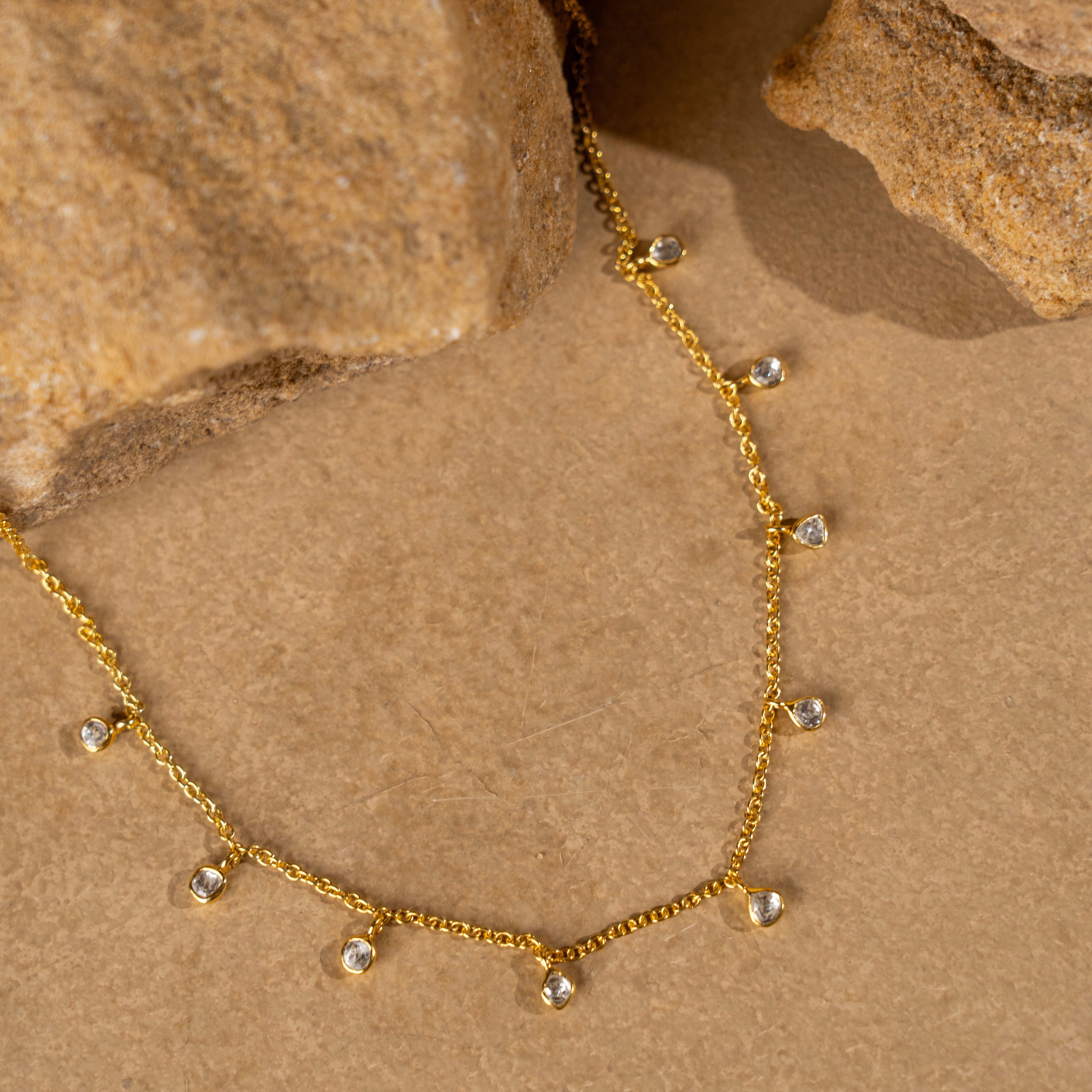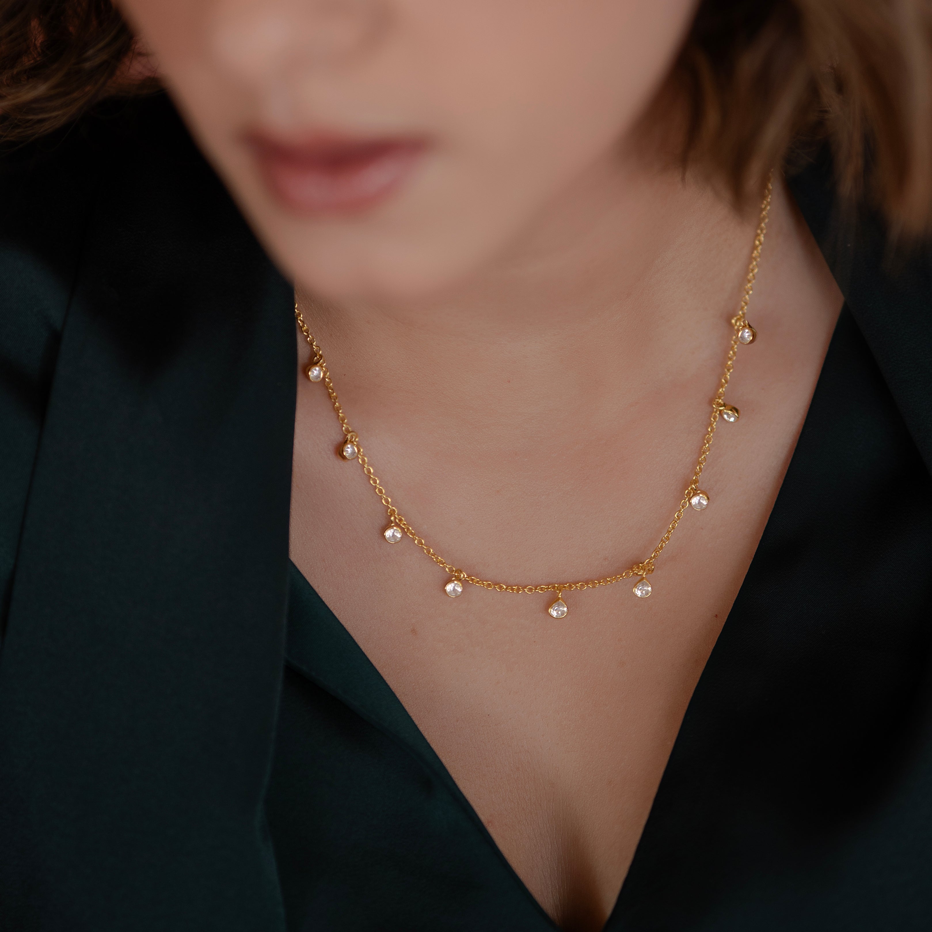 The Dew Drop Necklace is a stunning handcrafted jewelry piece that blends elegance with timeless charm. Featuring moissanite stones, bezel-set to resemble delicate dewdrops, this necklace sparkles beautifully with every movement. Made from 925 sterling silver and finished with a thick 18K gold plating, it offers both durability and a luxurious shine. Designed for versatility, this gold-plated moissanite necklace is perfect for layering or wearing solo, making it an essential accessory for both casual and formal occasions.
