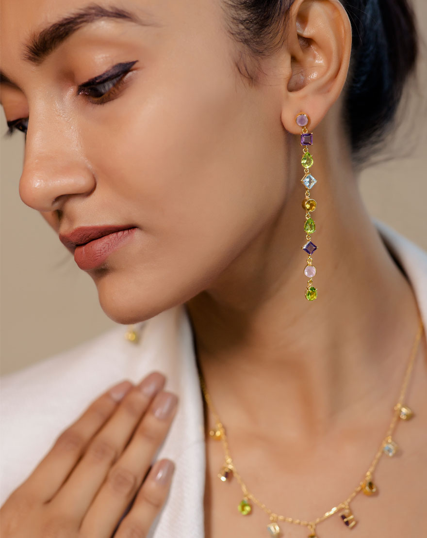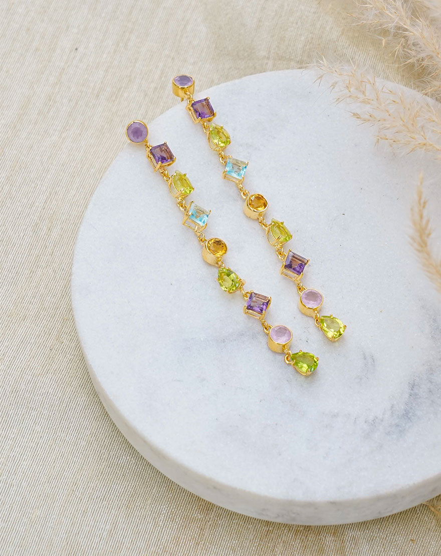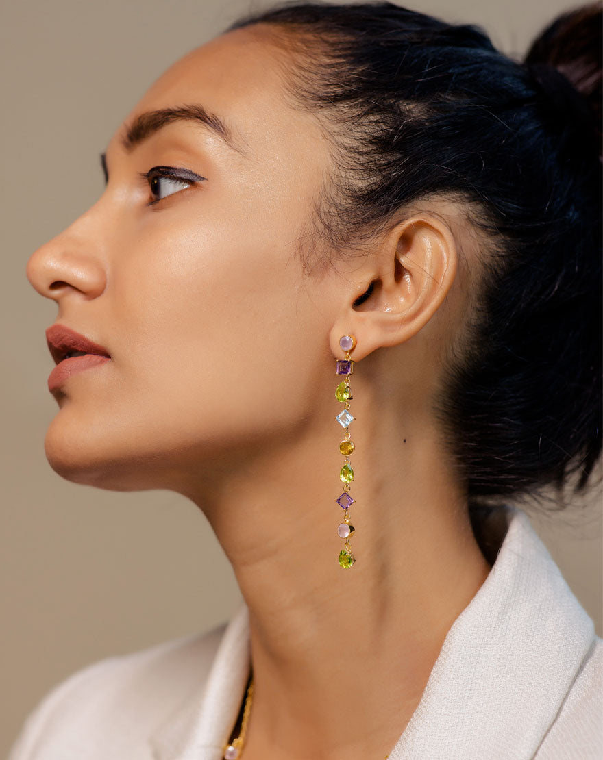 Diana Earrings is colorful elegance! These minimal yet statement making earrings are handcrafted using gold plated recycled brass with multicolored gemstones.