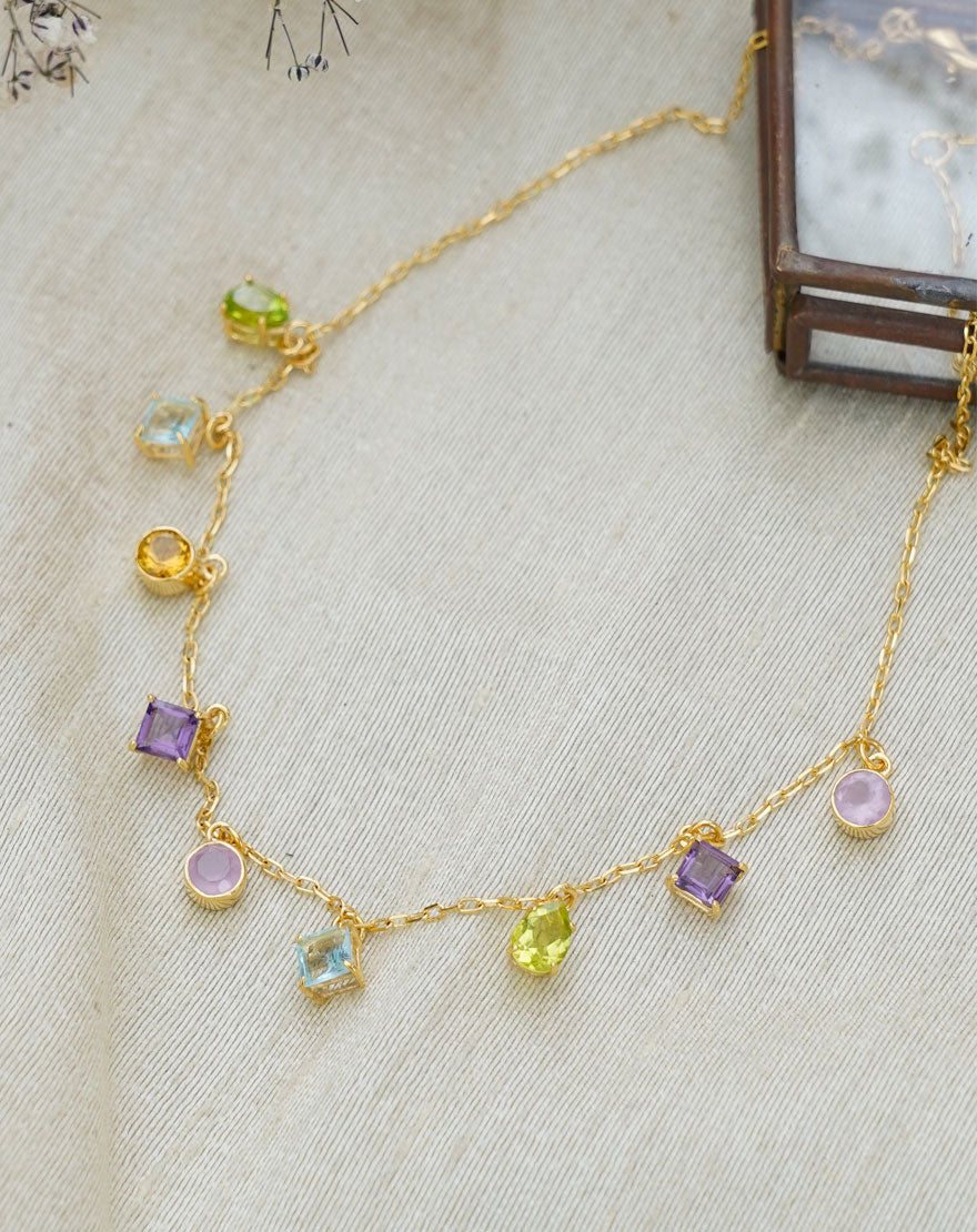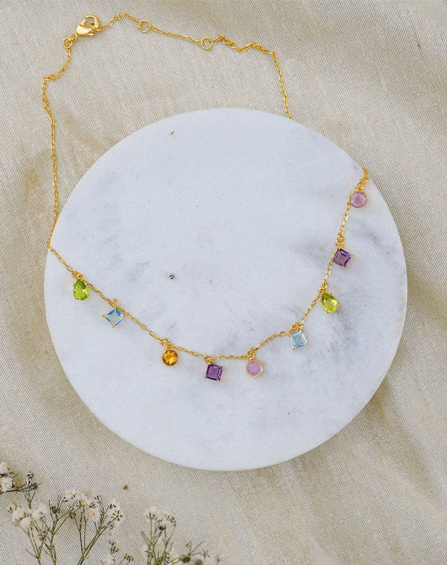 Diana Necklace is colorful elegance! This minimal yet statement making necklace is handcrafted using gold plated recycled brass with multicolored gemstones.