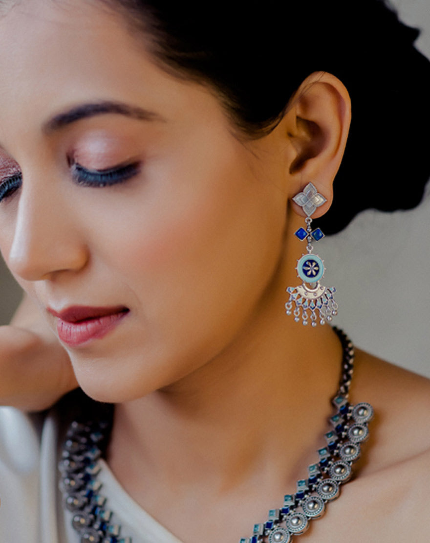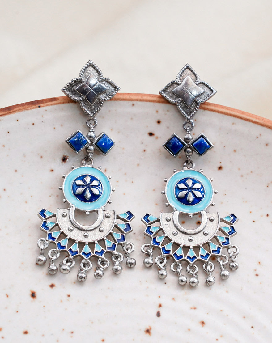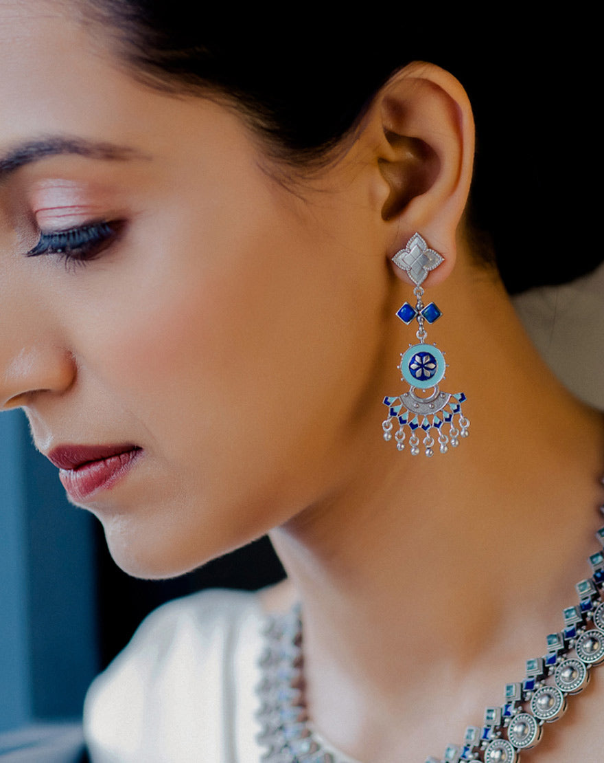 Farah Earrings Blue Aqua Chalcedony – These stunning pair of earrings are inspired from the architectural patterns found in the city of Marrakech (Morocco) handcrafted using silver plated brass with sky blue and lapis blue enamel and Aqua Chalcedony stones. These earrings are feather light in weight and a perfect pair of Indian Contemporary style.