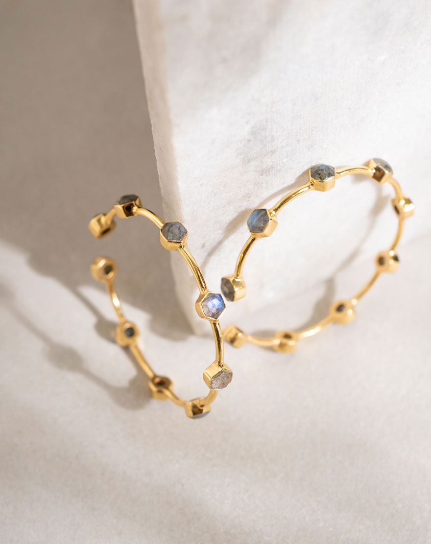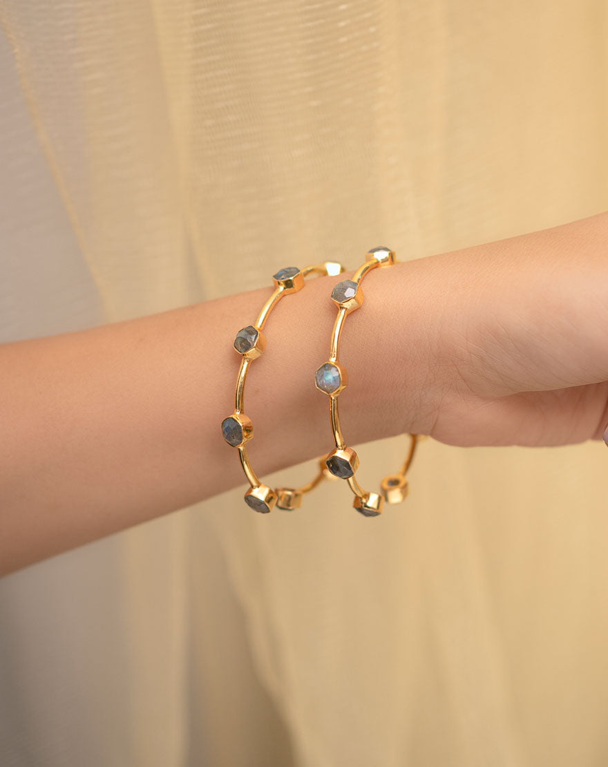 These beautiful Gemma Bangles are handcrafted using hexagon cut Labradorite on 18k gold plated recycled brass. These bangles are adjustable and can fit all sizes. As these are handmade please handle the adjustable mechanism very gently. They come in a set of 2 bangles.