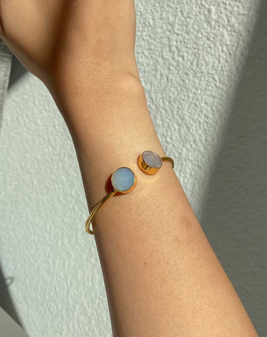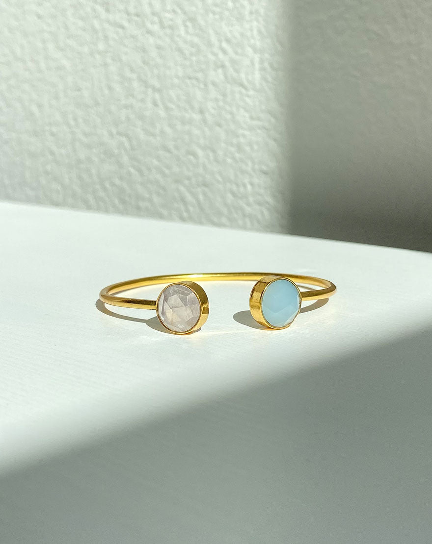 Gemma Bracelet – This beautiful handmade two stone bangle is made using Rose Quartz and Aqua Chalcedony on 1 micron gold plated brass. Perfect bangle bracelet for stone lovers.