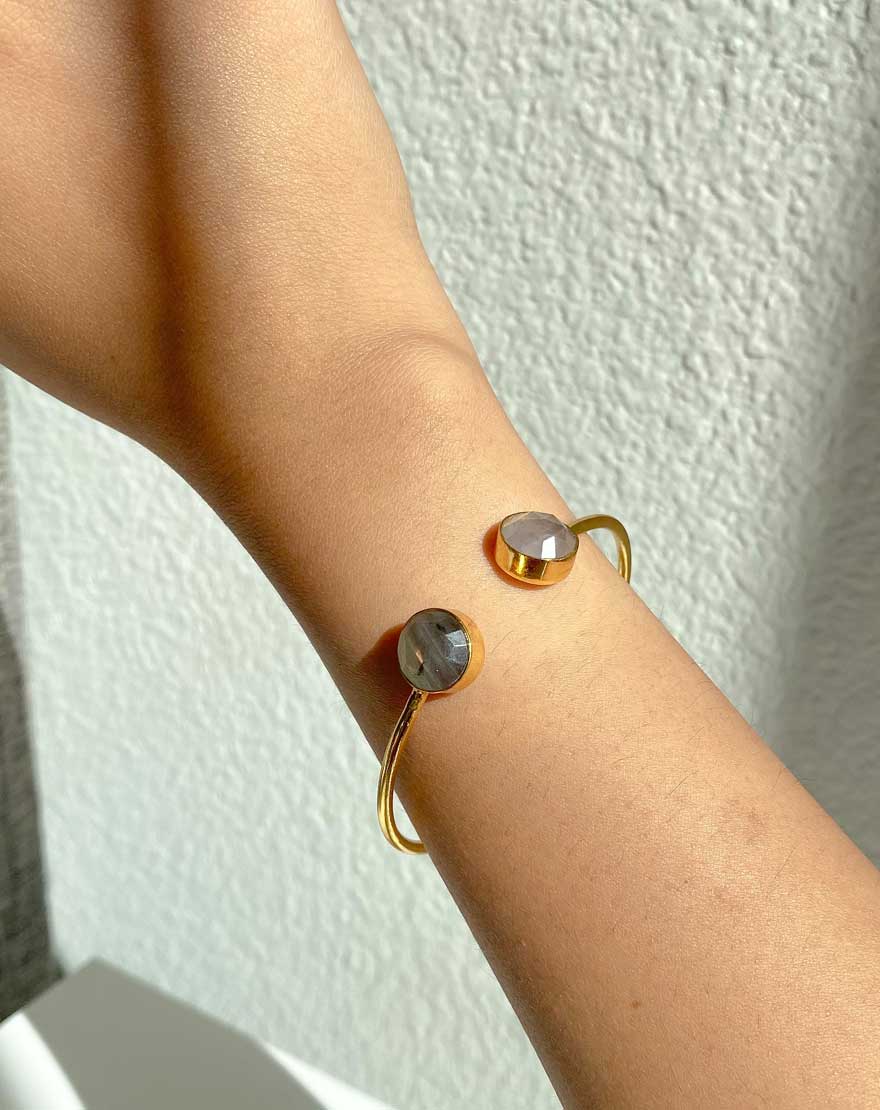 Gemma Bracelet – This beautiful handmade two stone bangle is made using Rose Quartz and Labradorite on 1 micron gold plated brass. Perfect bangle bracelet for stone lovers.