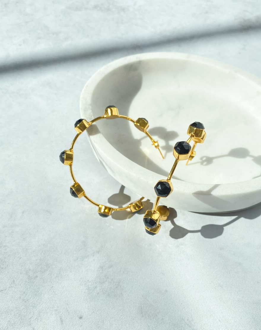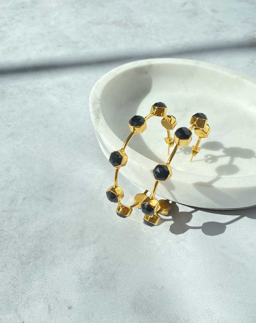 Gemma Hoops – These beautiful handmade hoop earrings are made using Black Onyx on 1 micron gold plated brass. Perfect statement making hoops for stone lovers.